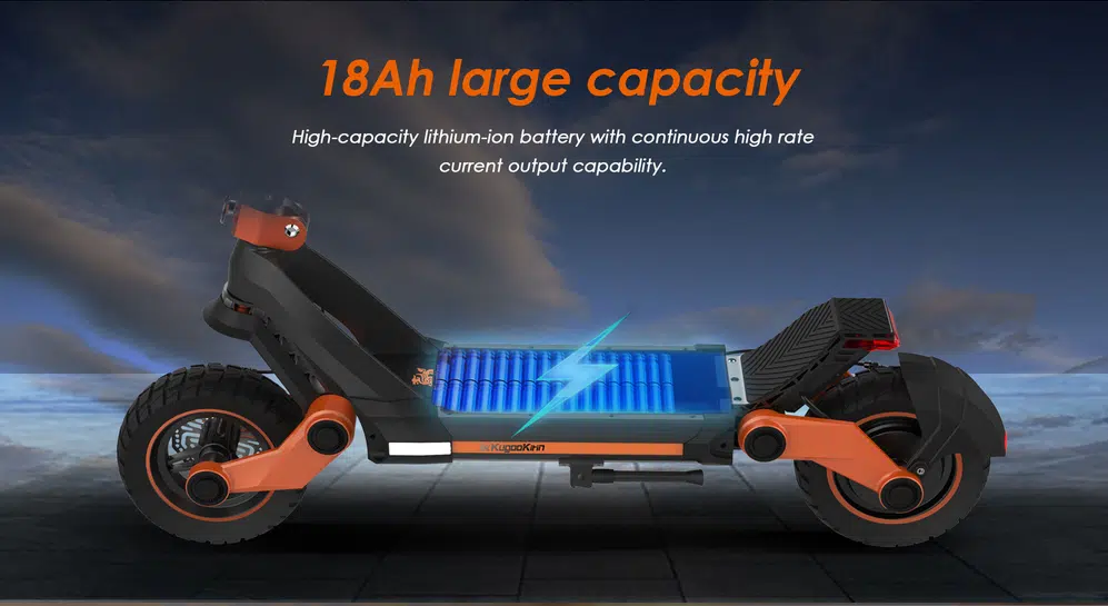 Auch wenn es um den Akku geht verfolgt man wohl die Devise: nicht kleckern, sondern klotzen. Der Akku hat eine Kapazität von 18 Ah womit der E-Scooter mit einer vollen Ladung auf eine Reichweite von bis zu 60 km kommen soll. Eine vollständige Akkufüllung soll daher auch bis zu 10 Stunden dauern.