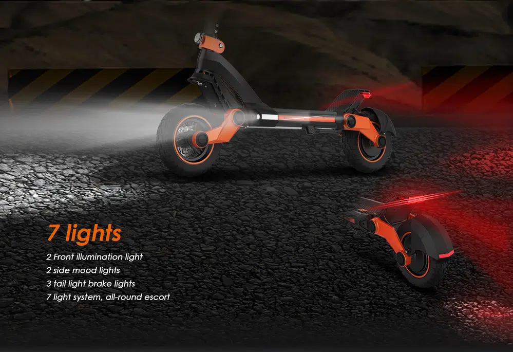 Auf dem Lenkrad nimmt das Display einen Großteil des Platzes ein. Alles in allem will man am Liebsten direkt ins Gelände, wenn man sich den Scooter ansieht. Auch bei schlechterem Wetter muss man sich keine Sorgen machen, denn der E-Scooter besitzt eine IP54 Zertifizierung. Zusätzlich hat man an dem Kugoo Kirin G3 gleich 7 verschiedene Lichter verbaut.