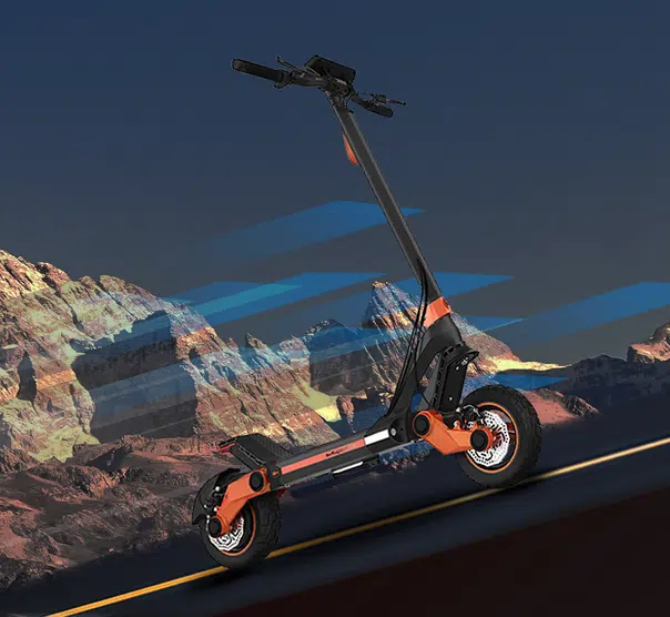 Damit der Scooter auch den schweren Anforderungen im Gelände auch gewachsen ist, verbaut der Hersteller hier einen 1200 Watt starken Motor. Dieser schafft es den Scooter auf eine maximale Geschwindigkeit von bis zu 50 km/h zu beschleunigen. Aber nicht nur hohe Geschwindigkeiten sind mit dem Roller zu erreichen, auch lassen sich Berge mit einer Steigung von bis zu 30° bewältigen und die maximale Tragkraft wird vom Hersteller mit 100 kg angegeben.