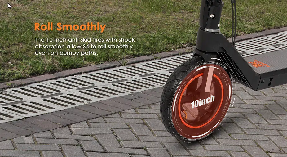 Der bürstenlose Gleichstrommotor mit 350W soll den Scooter mit konstanter und starker Leistung versorgen. Somit soll der Roller bis 35km/h schnell werden und Steigungen von bis zu 15° erklimmen können. Zudem gibt es beim Kugoo Kirin S4 10 Zoll Anti Rutsch Reifen. Durch die Stoßdämpfung soll man auch auf holprige Wege sanft fahren können. Also die besten Voraussetzungen für eine gebirgsreiche Umgebung. Die Belastbarkeit soll übrigens bei bis zu 100 kg liegen.