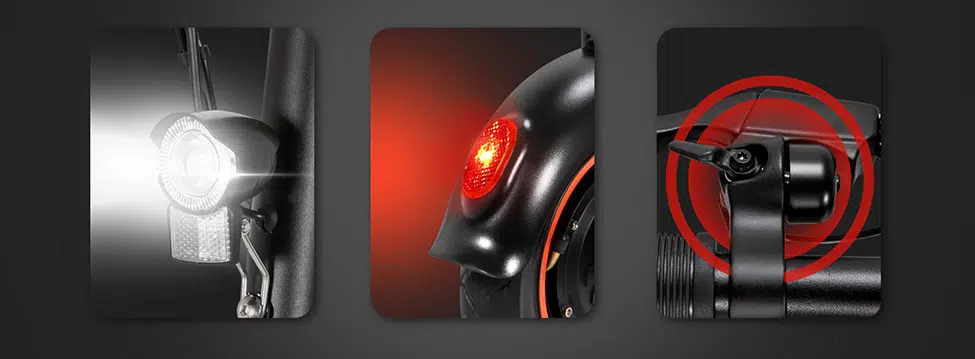 Für den Preis um die 350 € bekommt man hier nämlich einen 350 W starken Motor, der eine Neigung bis 15° schaffen soll. Zudem hat er Energierückgewinnungssystem womit ihr den Akku teils wiederaufladen könnt. Und für die Sicherheit ist auch gesorgt! Den neben den Scheibenbremsen und E-ABS, gibt es auch eine Klingel und genügend Licht, sodass man euch auch sieht.