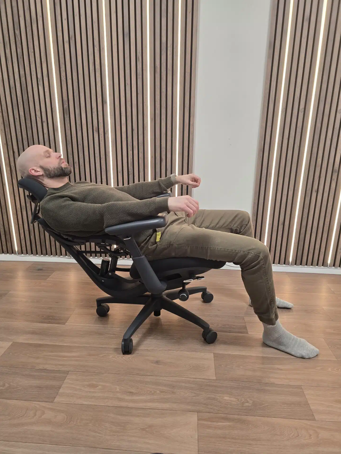 Auch abseits der Rückenlehne hat der Omni einiges zu bieten. Die Neigungsverstellung von 105° bis 160° deckt sowohl konzentriertes Arbeiten als auch entspanntes Zurücklehnen ab. Besonders praktisch: Die Armlehnen bewegen sich mit, was die Haltung konsistent hält.