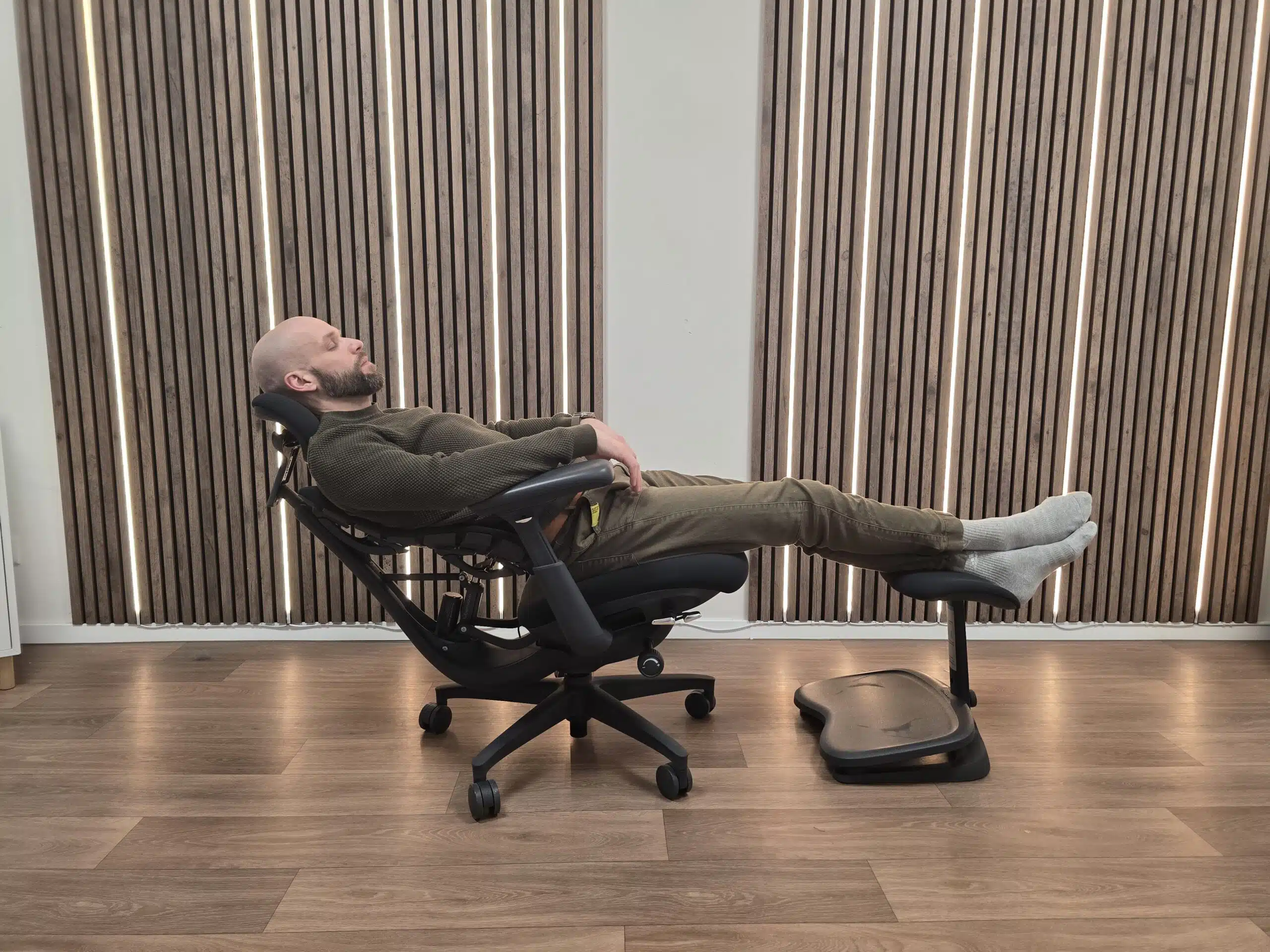 Die optionale StepSync-Fußstütze wirkt erstmal unscheinbar, macht im Alltag aber mehr aus, als man denkt. Durch die 10° Neigung werden die Beine spürbar entlastet, was gerade bei langen Sessions hilft, Ermüdung zu reduzieren. Zusammen mit der 160°-Liegeposition des Omni Chairs wird daraus fast schon eine kleine Chill-Zone unterm Schreibtisch.