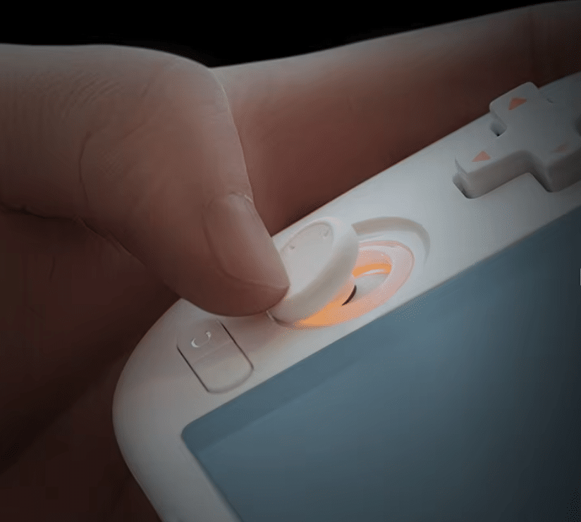 Oberhalb liegen die 4 Hall Trigger Schultertasten, die je nach gewählter Farbvariante in Rot oder Orange vorliegen, sowie die Lautstärketaste und der „Ein“ und „Aus“ Knopf. Im Inneren sitzt ein 6-Achsen-Gyroskop für theoretische Bewegungssteuerung.
