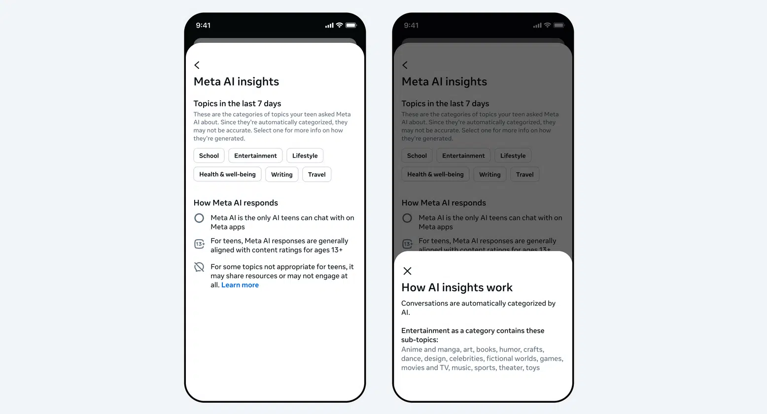 Die neue Funktion erscheint in einem Insights-Tab innerhalb der Aufsichtsfunktionen, sowohl in der App als auch im Web. Eltern bekommen dabei keine direkten Gesprächsinhalte zu sehen, sondern lediglich Themenkategorien. Meta unterteilt diese in Bereiche wie Schule, Unterhaltung, Lifestyle, Reisen, Schreiben oder Gesundheit und Wohlbefinden. Jedes Hauptthema lässt sich weiter aufschlüsseln: Unter Lifestyle finden sich beispielsweise Unterkategorien wie Mode, Essen und Feiertage, während Gesundheit und Wohlbefinden Fitness, körperliche Gesundheit und mentale Gesundheit umfasst.