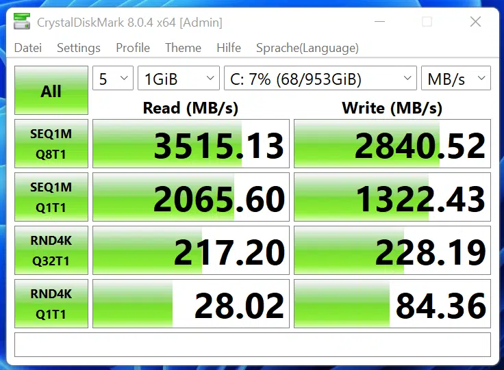 Je nach gestarteten Programm gibt es kaum Ladezeiten. Öffnet man den Browser oder einen YouTube Clip, ist das im Handumdrehen erledigt. Daran ist nicht nur der große Arbeitsspeicher mit 16 oder sogar 32 GB geschuldet, sondern auch der sehr flotten Speicheranbindung des NVMe SSD Speichers mit sehr guten 3500MB/s Lese- und 2800MB/s Schreibraten aufwarten kann.