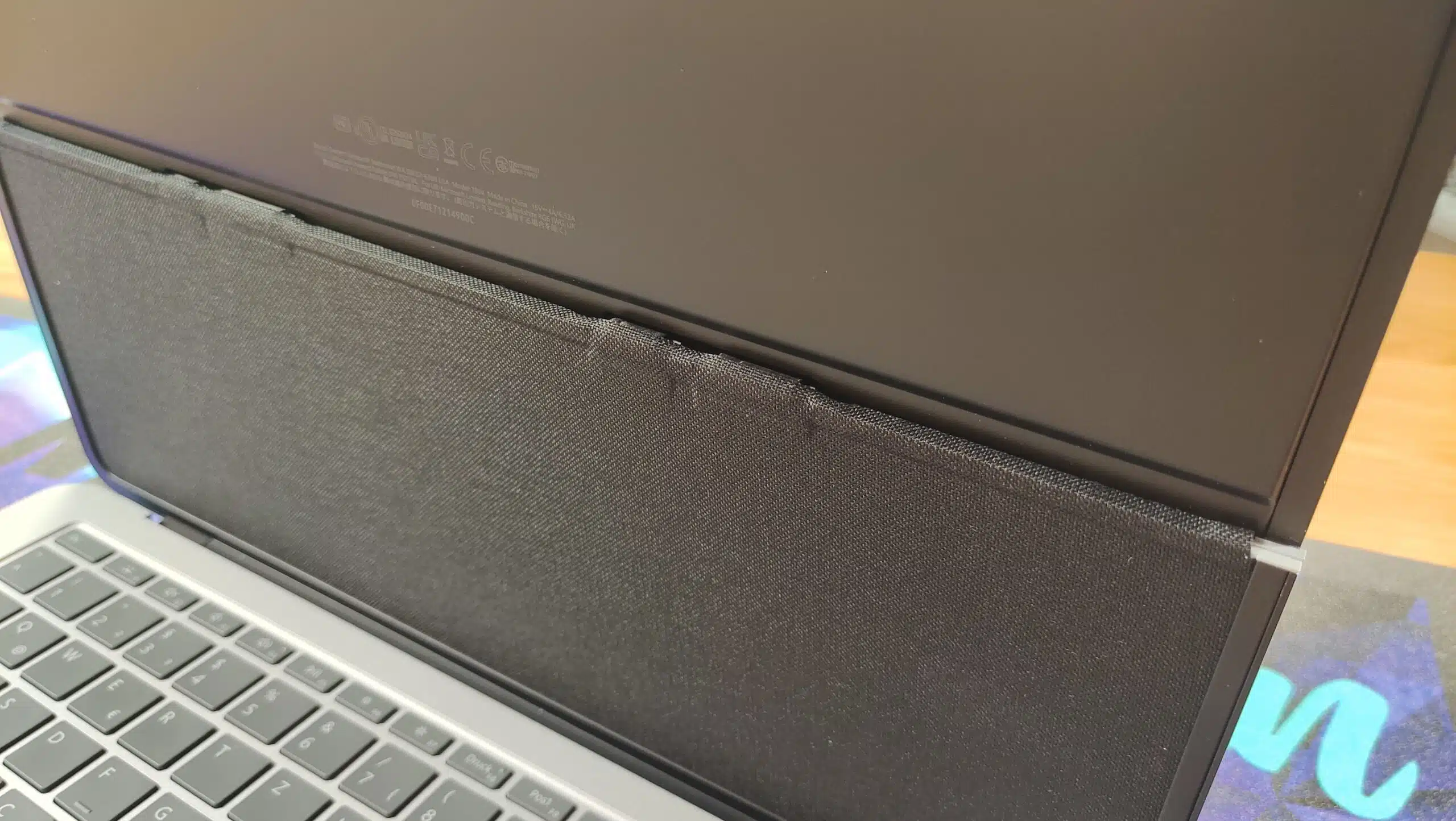 Wie lange die Scharniere so straff und recht fest arbeiten, kann man vorab nicht beurteilen. Die Auflagefläche des Displays ist mit Stoff überzogen und die um 180° biegbaren Kabel sieht man so nicht.