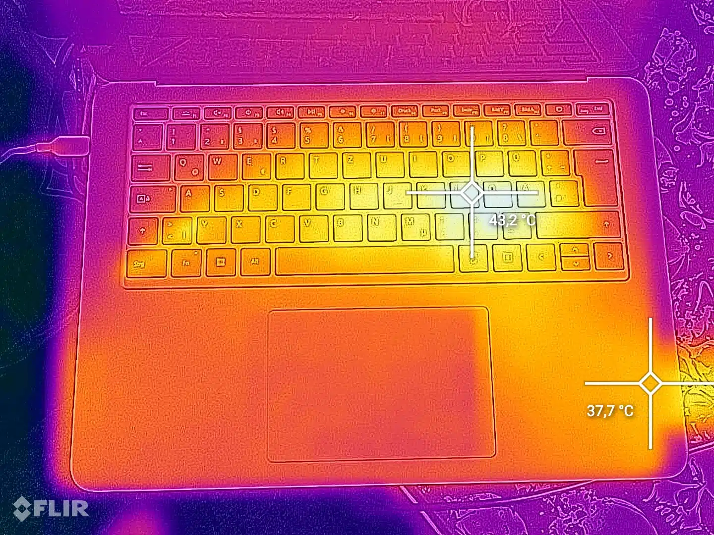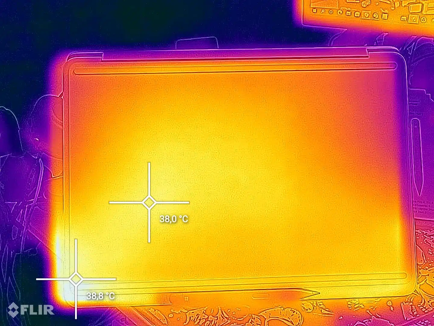 Unter Volllast ist das Notebook dezent zu hören. An den seitlichen Öffnungen spürt man den ein- und austretenden Luftstrom leicht. Auf der Tastatur hält sich die Abwärme und Hitzeentwicklung hingegen zurück. Lediglich am rechten Gehäuse- und Tastaturrand erreichen wir etwas über 42°C.