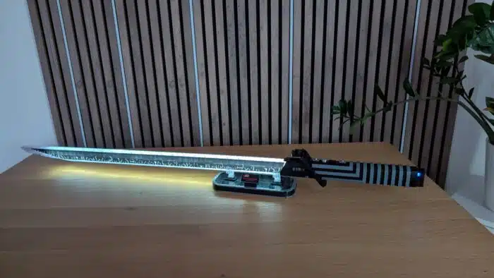 Durch Knopfdruck lässt sich das Licht einschalten. Da die Klinge, aus durchsichtigen Klemmbausteinen besteht, leuchtet sie somit komplett & das sieht richtig cool aus! Zudem lädt man es über USB-C einfach wieder auf.