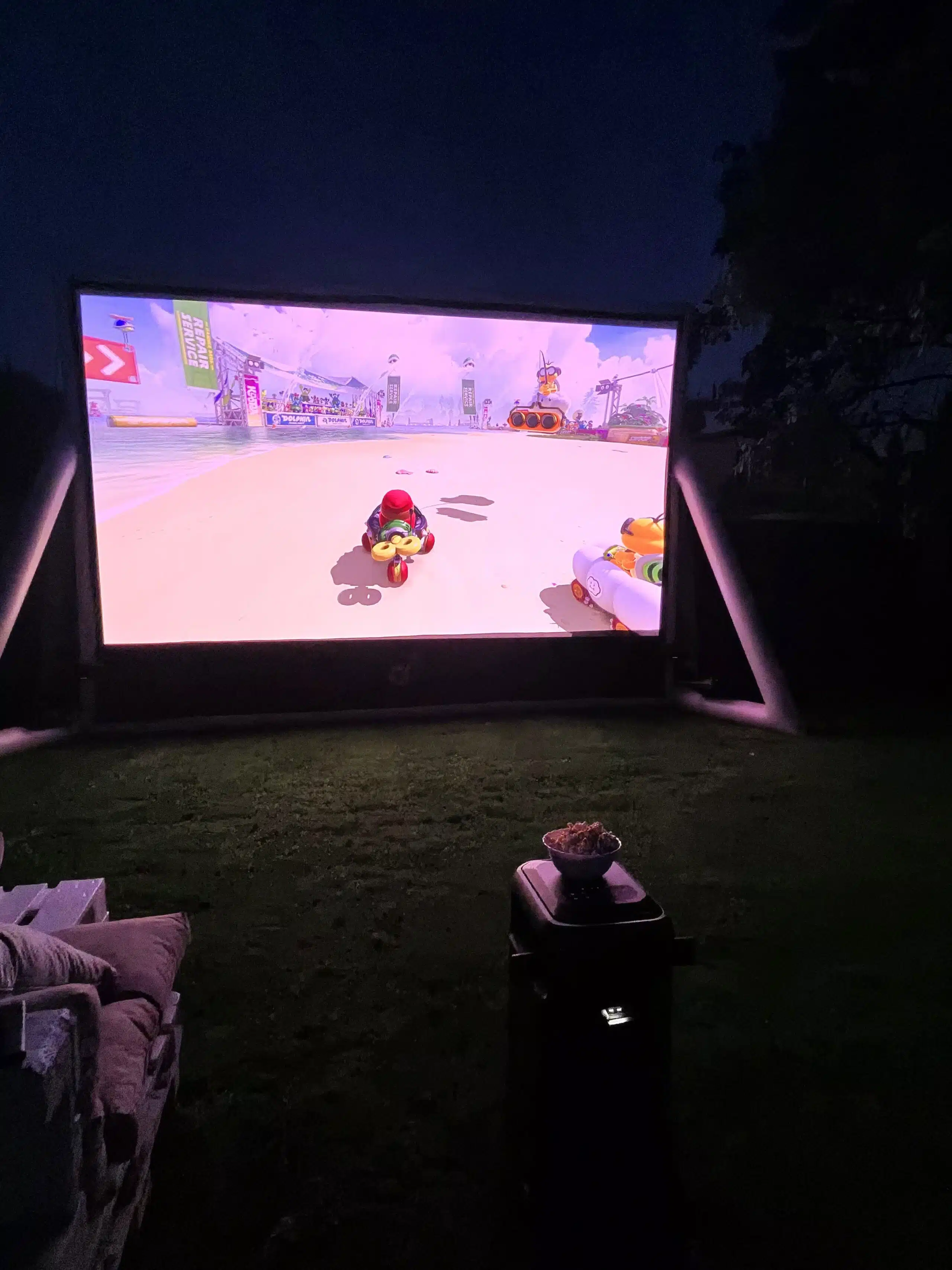 Je nach Abstand lassen sich Bilddiagonalen von 200 Zoll auf 6 m bis hin zu 300 Zoll auf 7,6 m projizieren. Die Outdoor-Leinwand muss allerdings separat erworben werden, einen Preis gibt es dazu aber noch nicht. Das wird sicherlich mit dem Starten der Kickstarter Kampagne verändert. Der Projektor ist zudem mit Rollen ausgestattet, um ihn leicht von Wohnzimmer zu Garten oder anderen Räumen bewegen zu können.