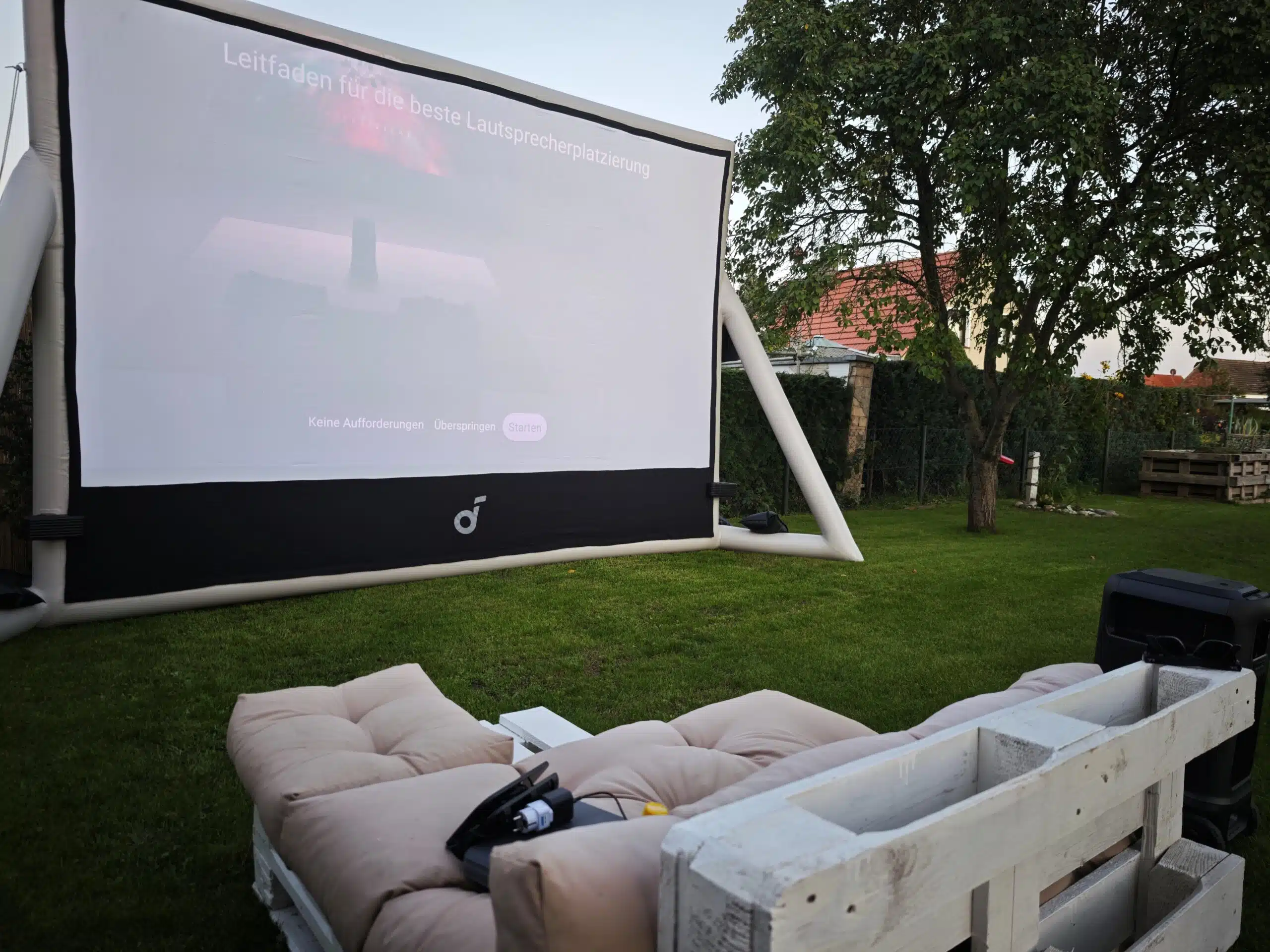 Der Aufbau ist wirklich ein Kinderspiel und extrem schnell erledigt. Für Besitzer der Leinwand sind Aufnahmen für den linken und rechten Speaker integriert. Mit dem Starten des Projektors wird auch ein separates Menü zum Einmessen der 4 Speaker geöffnet, bei gleicher Position lässt sich dies natürlich auch überspringen.