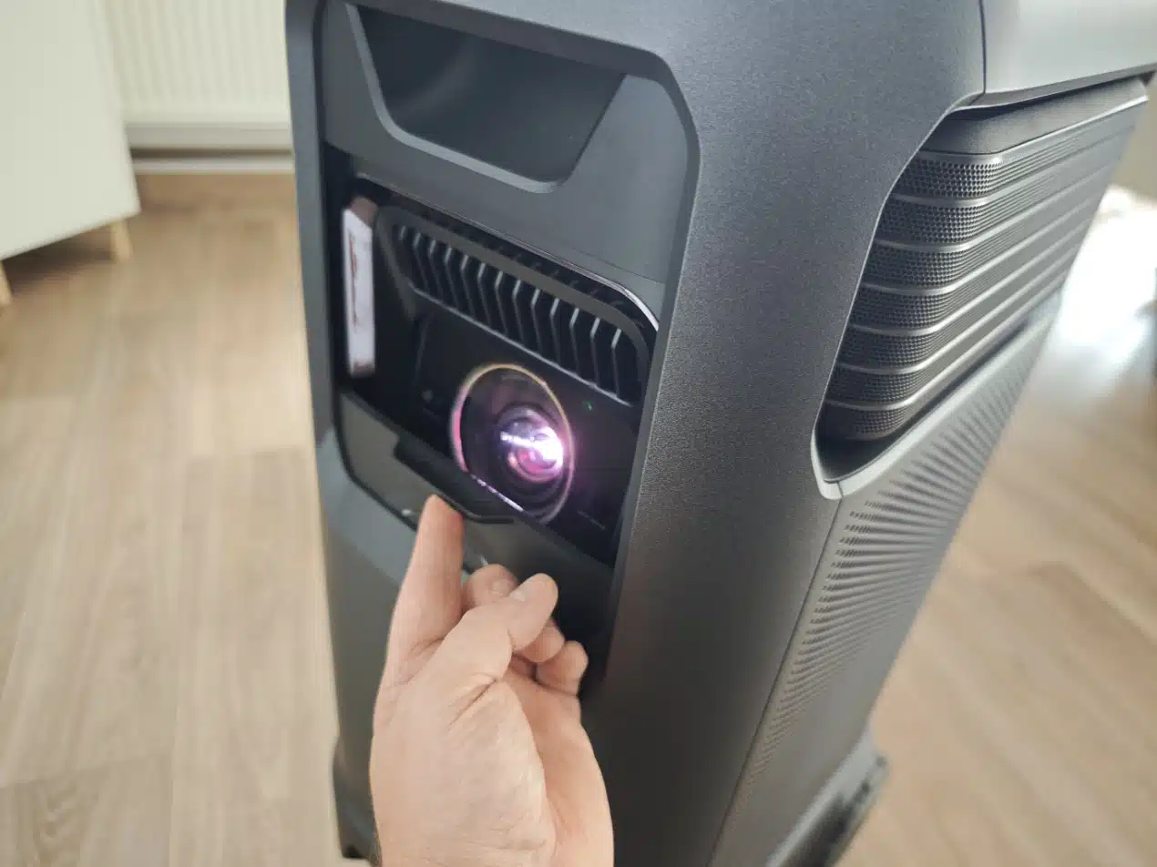 Die Einrichtung oder Ausrichtung des Projektors ist nach wie vor ein Kinderspiel. Für den Betrieb wird eine aktive Stromversorgung benötigt, im Betrieb verbraucht der Projektor ~250 Watt. Also Kabel aus dem Fuß gezogen, in eine Steckdose verfrachtet und angeschaltet. Beim Starten wird das Bild automatisch ausgerichtet, scharfgestellt, auf Wunsch auf die Leinwand angepasst oder so angepasst, dass Hindernisse vermieden werden.