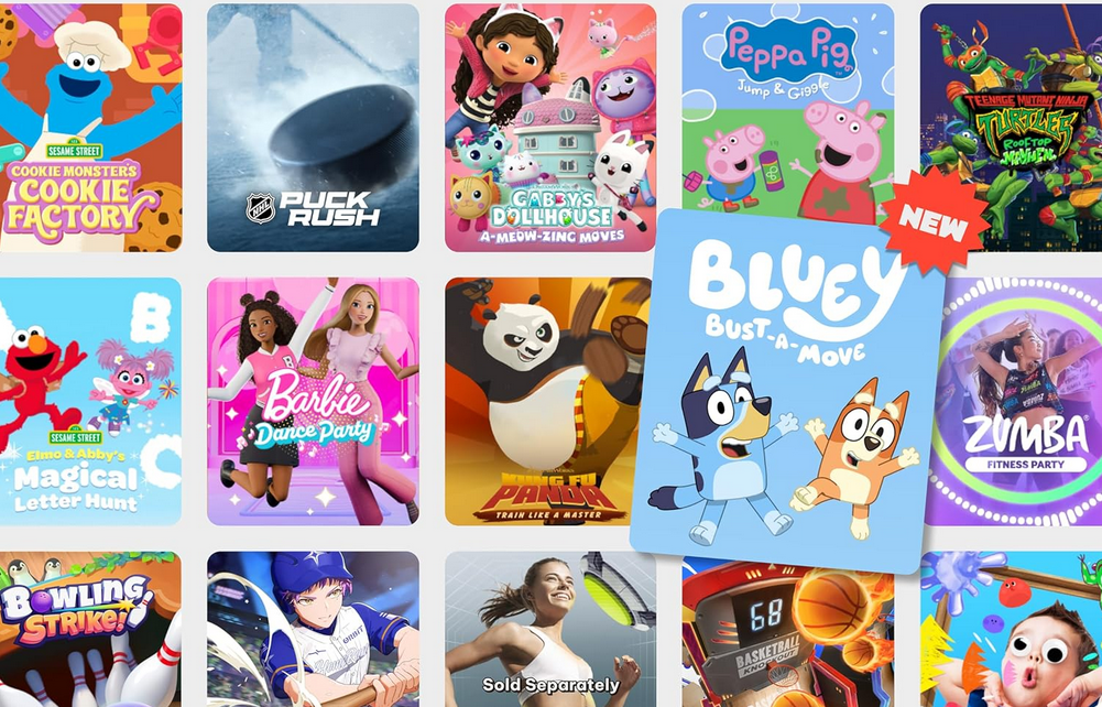 Die Zielgruppe ist klar definiert: Familien und Kinder. Spielemarken wie Peppa Pig, Bluey, Barbie, Elmo, Miraculous Ladybug oder Teenage Mutant Ninja Turtles dominieren das Angebot. Ergänzend gibt es Sporttitel wie Zumba, Baseball oder Bowling, also Programme, die das Wohnzimmer zum Fitnessstudio oder zur Mini-Spielhalle machen.