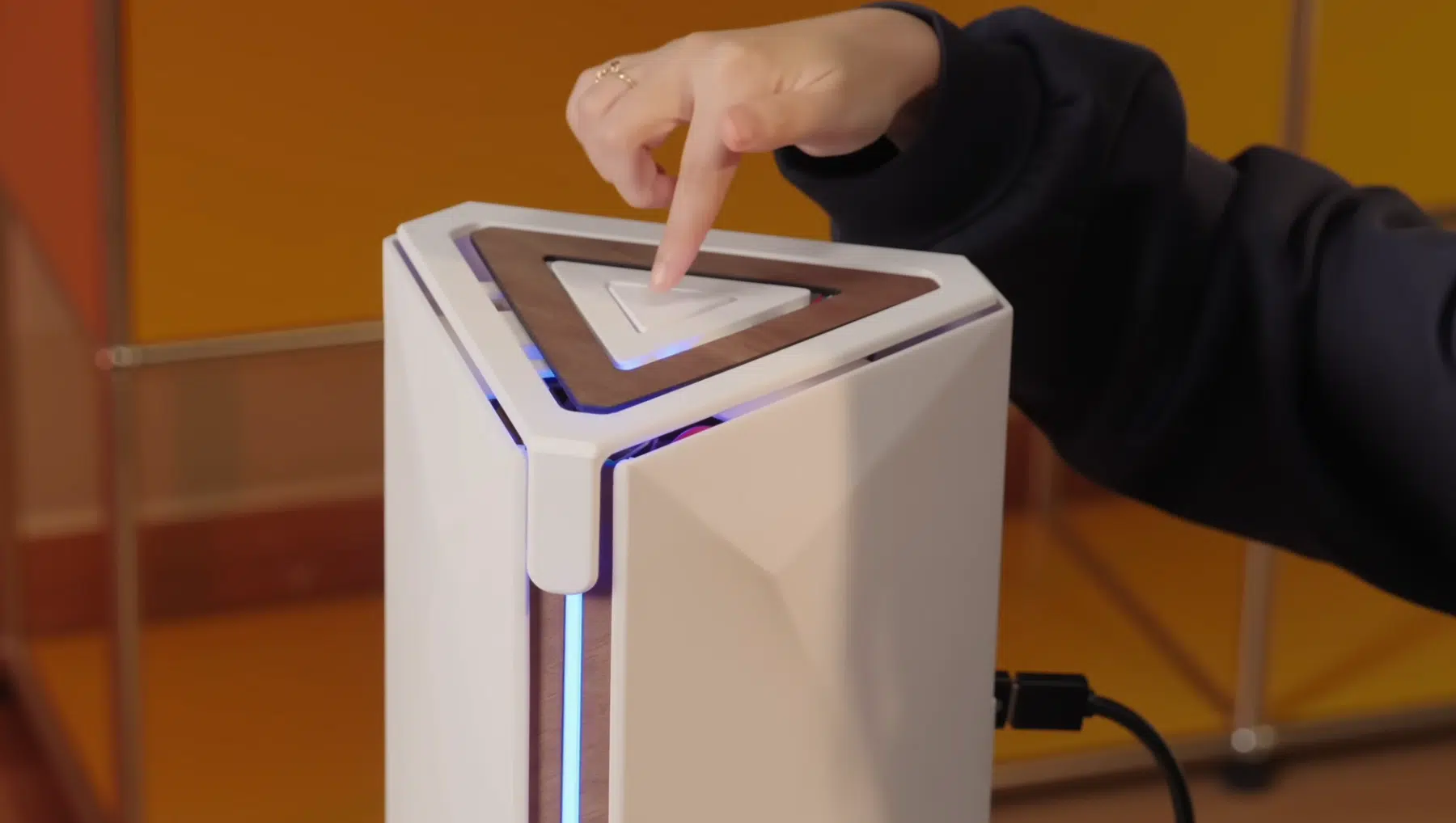 Der Clou steckt in der Thermik. Als Vorlage dient der Mac Pro 2013 („Trash Can“) mit seinem zentralen, dreieckigen Kühlkern: ein triangularer Prismenkörper, an dessen drei Seiten Platinen anliegen, während ein Lüfter die warme Luft nach oben abzieht. Genau dieses Layout überträgt die YouTuberin auf die Konsolen-Hardware. Unter dem Kühlblock sitzt ein 120-mm-Lüfter, der Luft von unten nach oben drückt.