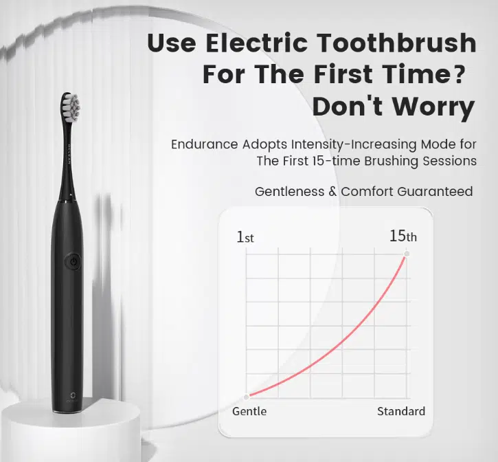 Damit einem der Einsteig in das Zähneputzen mit Ultraschall leichter gelingt, setzt die Oclean Endurance auf eine automatische Anpassung der Schwingungsintensität. Was bedeutet, dass die Zahnbürste während der ersten 15 Anwendungen die Stärke langsam erhöht und beim 16. Putzvorgang erreicht die Zahnbürste dann ihre volle Leistung.