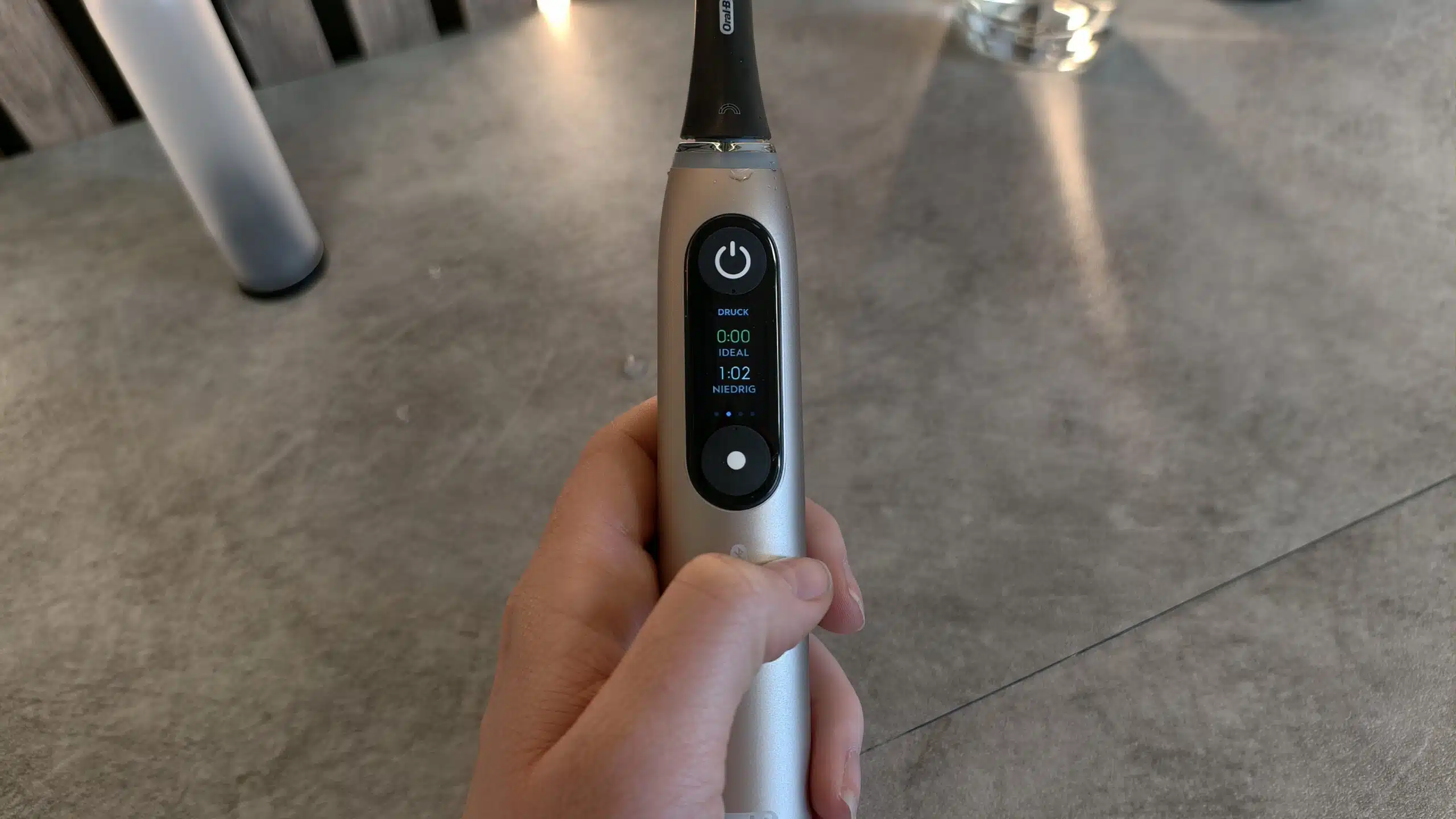 Ebenfalls überarbeitet wurde die Akkuanzeige. Die Zahnbürste gibt nun frühzeitig einen Hinweis, wenn nur noch wenige Anwendungen möglich sind. Ergänzt wird das durch eine genauere Akkustandsanzeige, die den aktuellen Wert klarer darstellt, wo die reguläre iO 10 hier noch mit Segmenten und Prozentangabe arbeitet.