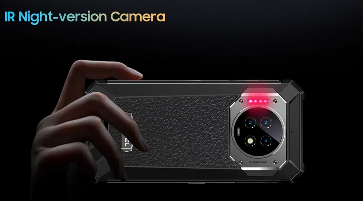 Auf der Rückseite hat das Oukitel WP19 ein dreier Kamera Setup. Die Hauptkamera ist ein 64 MP Samsung S5K Sensor mit eine Blende von f/1.79. Dazugesellt sich ein Sony IMX350 Nachtsichtsensor, der mit 4 zusätzlichen Infrarotsensoren arbeitet. Die letzte Kamera ist eine Makrokamera mit 2 MP und einer Blende von f/2.4.