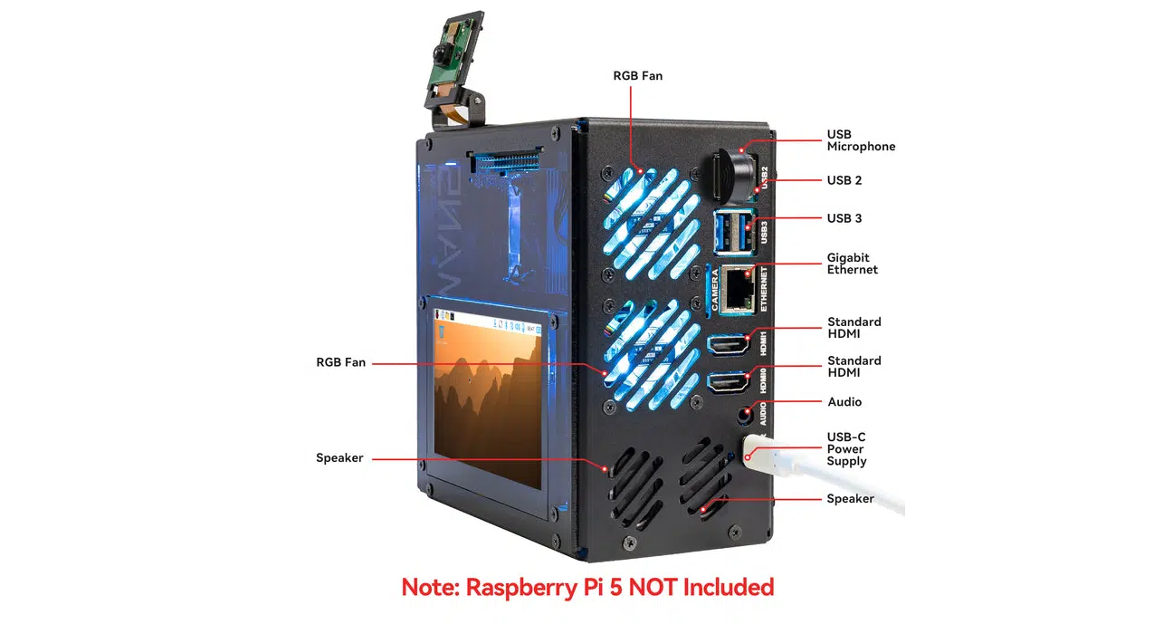 SunFounder stellt mit dem Pironman 5 Pro Max ein umfangreich ausgestattetes Gehäuse für den Raspberry Pi 5 vor. Das 123-Euro-Gehäuse bietet zwei M.2-Slots mit RAID-Support, einen 4,3-Zoll-Touchscreen und eine aufwendige Kühlung mit Tower-Kühler und RGB-Lüftern. Aktuell ist das Gehäuse beim Hersteller gelistet, aber noch nicht verfügbar.