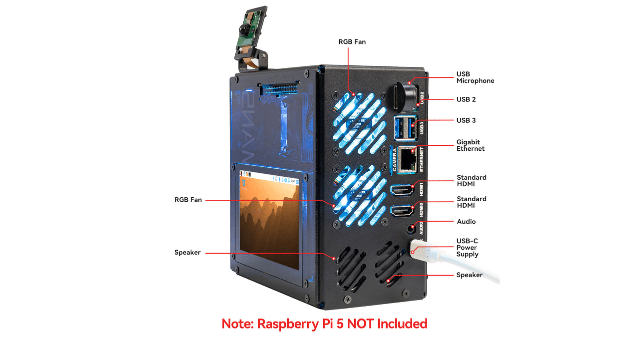 Zusätzlich bietet das Gehäuse einen Metal-Power-Button für sicheres Herunterfahren, einen externen GPIO-Extender, RTC-Batterie-Support und zwei vollwertige HDMI-Ports. Die Abmessungen von 140,9 × 77,0 × 138,7 Millimetern machen das Gehäuse kompakt genug für den Schreibtisch, aber groß genug für vernünftiges Kabelmanagement.