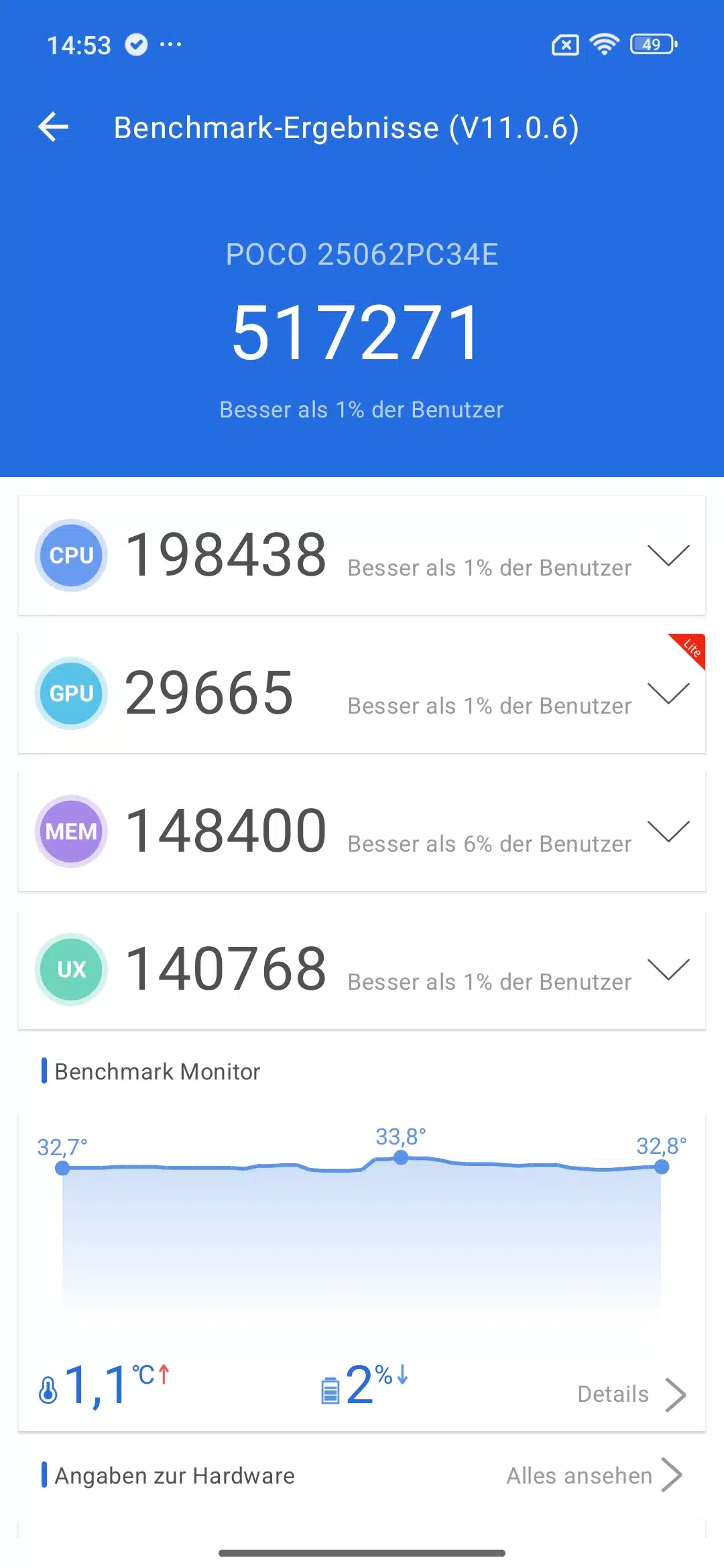 Aber egal wie stark man das System beansprucht ob nun unter Antutu oder CPU Throttling Test: es bleibt angenehm „kühl“ mit knapp über 32°C an einigen Spots. Selbst ein Genshin Impact (in schwacher Auflösung und wenigen Details) läuft flüssig und produziert auch keine wirklich spürbare Abwärme. Wenn High- End SOCs mal so kühl bleiben würden.