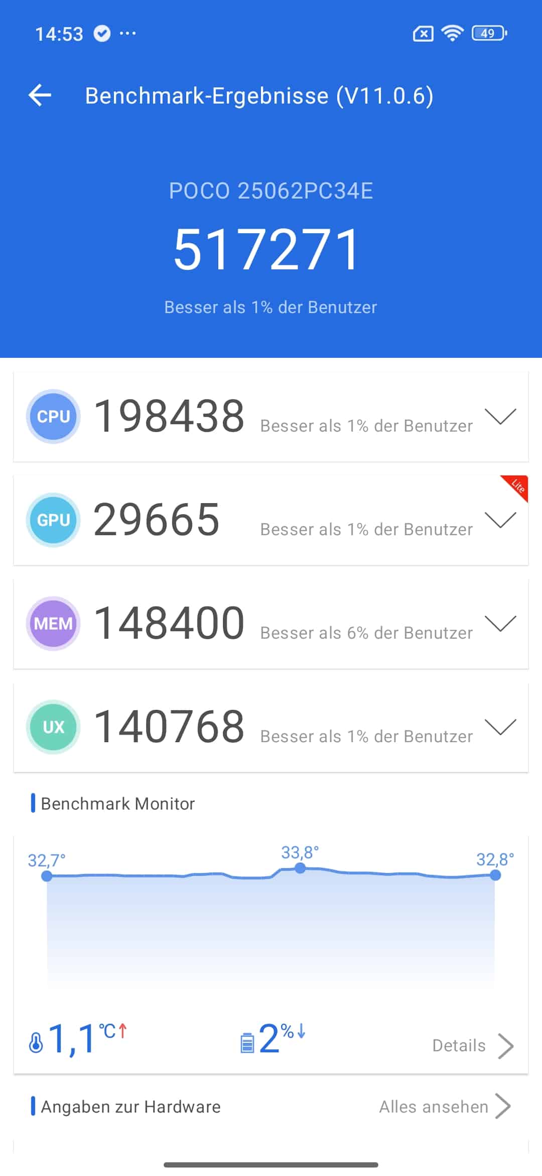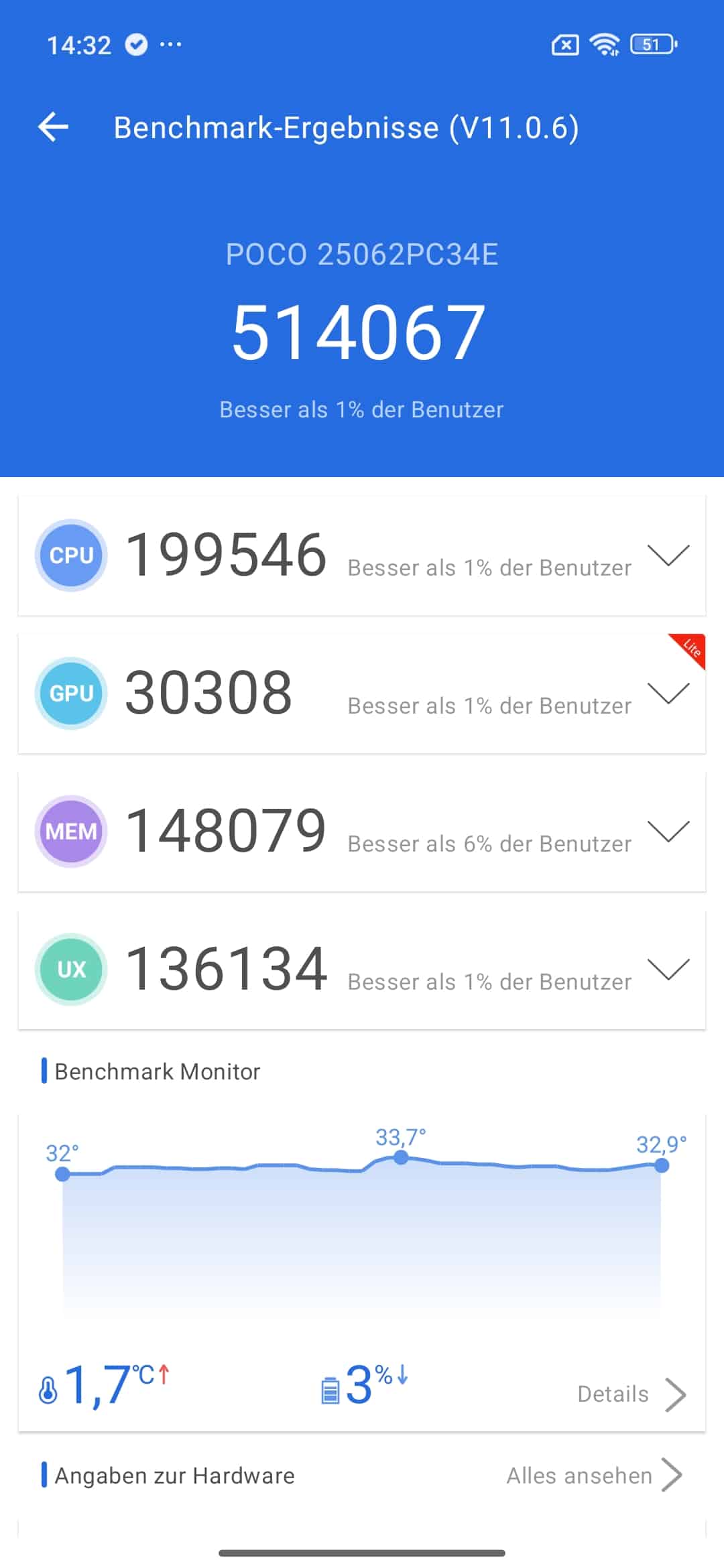 Aber egal wie stark man das System beansprucht ob nun unter Antutu oder CPU Throttling Test: es bleibt angenehm „kühl“ mit knapp über 32°C an einigen Spots. Selbst ein Genshin Impact (in schwacher Auflösung und wenigen Details) läuft flüssig und produziert auch keine wirklich spürbare Abwärme. Wenn High- End SOCs mal so kühl bleiben würden.