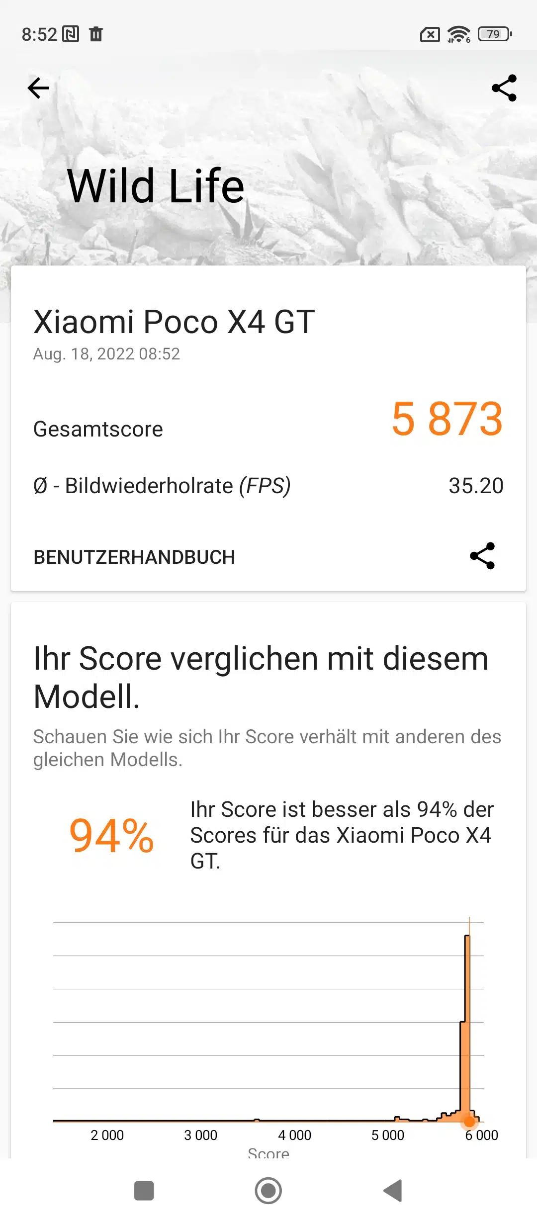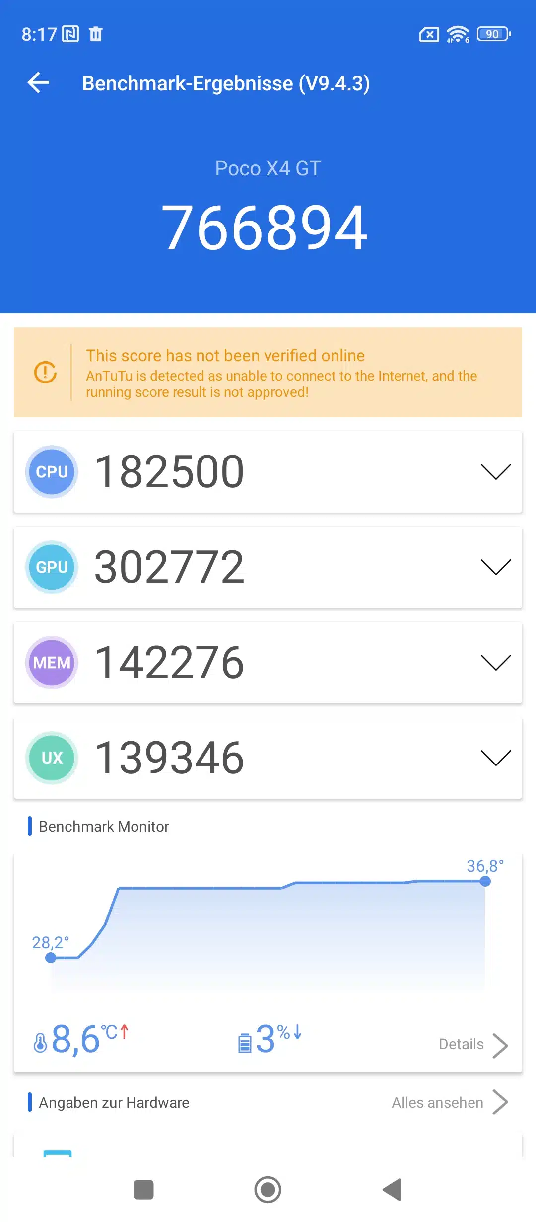 Das Highlight beim Poco X4 GT ist definitiv der Prozessor. Hier setzt man auf den neuen Mediatek Dimensity 8100, ein Octa-Core-Prozessor mit bis zu 2,85 GHz Taktfrequenz, gefertigt in 5nm. Oder auch anders ausgedrückt: einen Prozessor der auch in jedem anderen Flagship hätte verbaut sein könnte. Vor allem punktet der Prozessor dadurch, dass er nicht die selben Hitzeprobleme besitzt, wie es die aktuelle Generation 8 aus dem Hause Snapdragon leider hat. Hier kann Mediatek absolut überzeugen und im CPU Stress Test zeigt er kaum signifikante Drosselungen und das nach mehreren Antutu Benchmark durchläufen.
