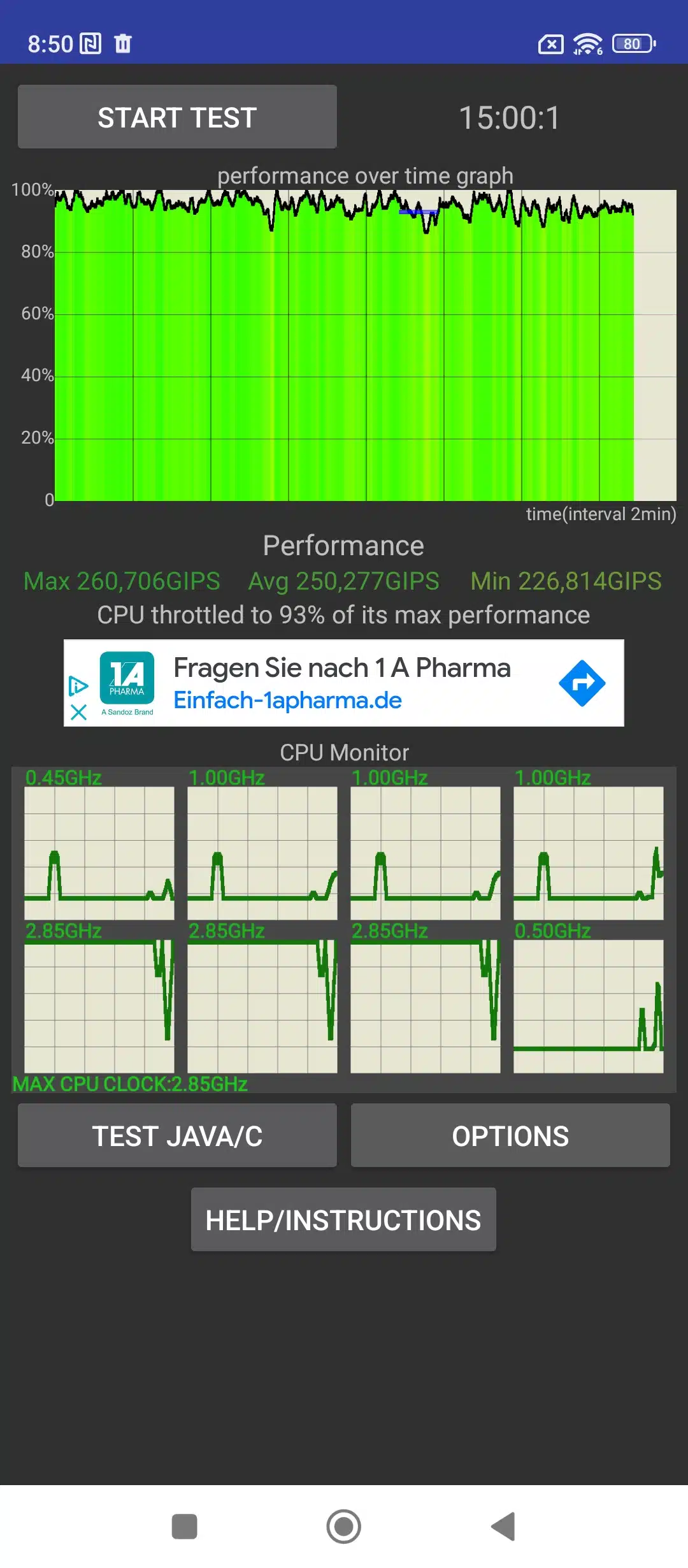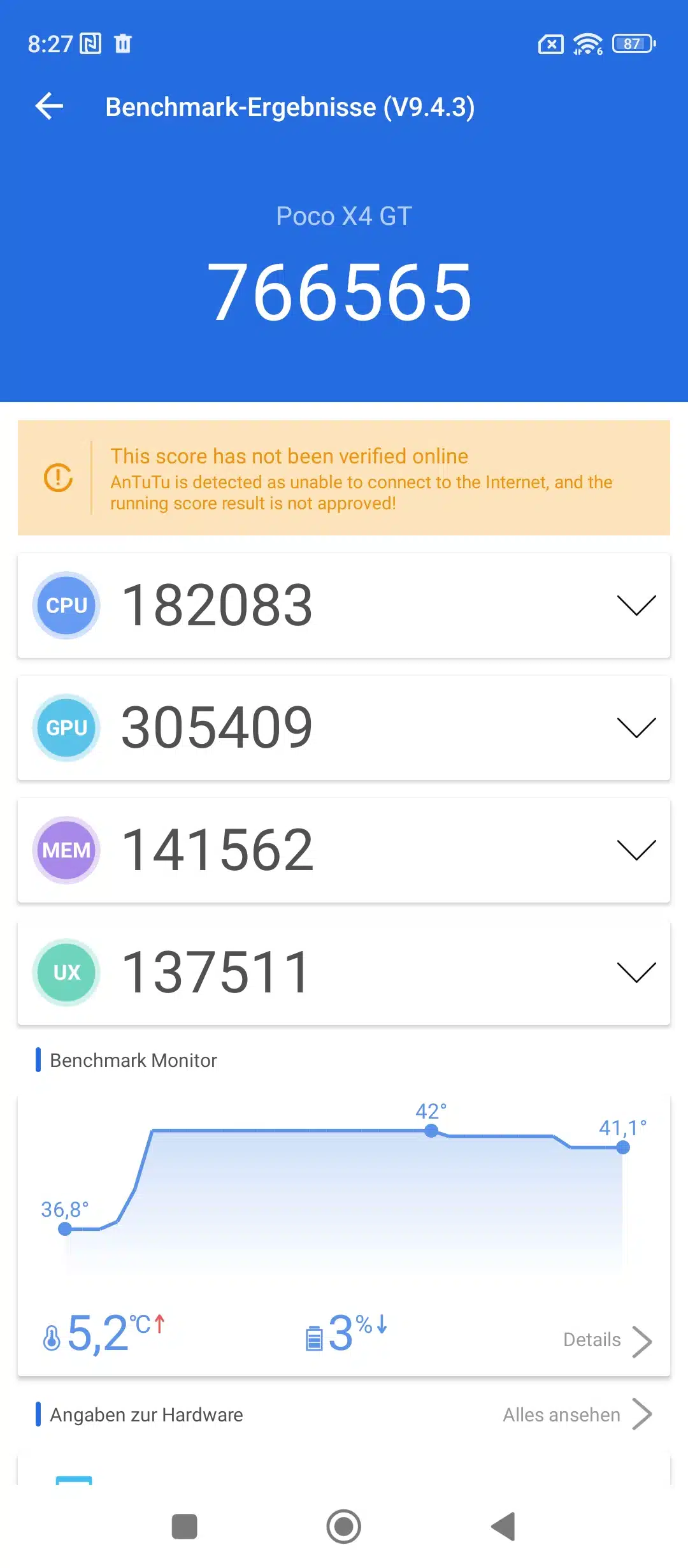 Rein von der Performance haben wir hier definitiv das schnellste Smartphone unter 400€ am Start. Unter der neusten Antutu Version erzielen wir ~766.000 Punkte, selbst in zweiten Durchlauf verlieren wir hier nur wenige hundert Punkte. Der direkt danach gestartete CPU Stress Test offenbart die effektive Kühlung unter Volllast. Keine Drosselung und auch keine über 40°C am Gehäuse. Klasse!