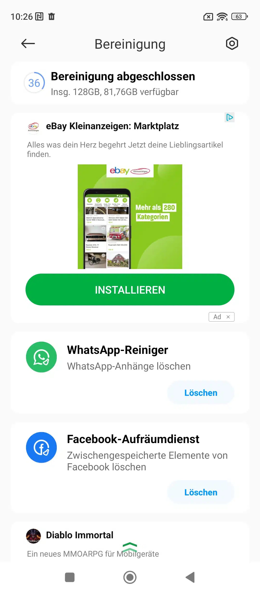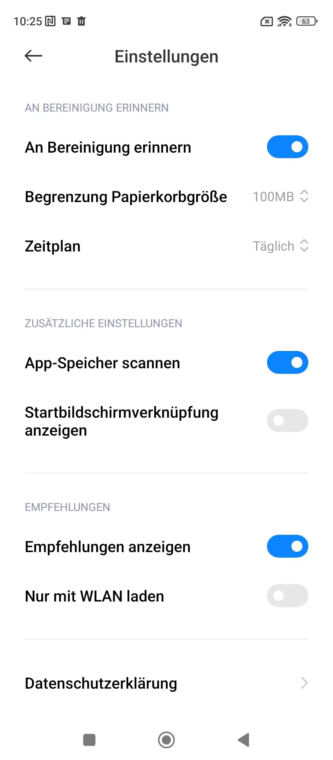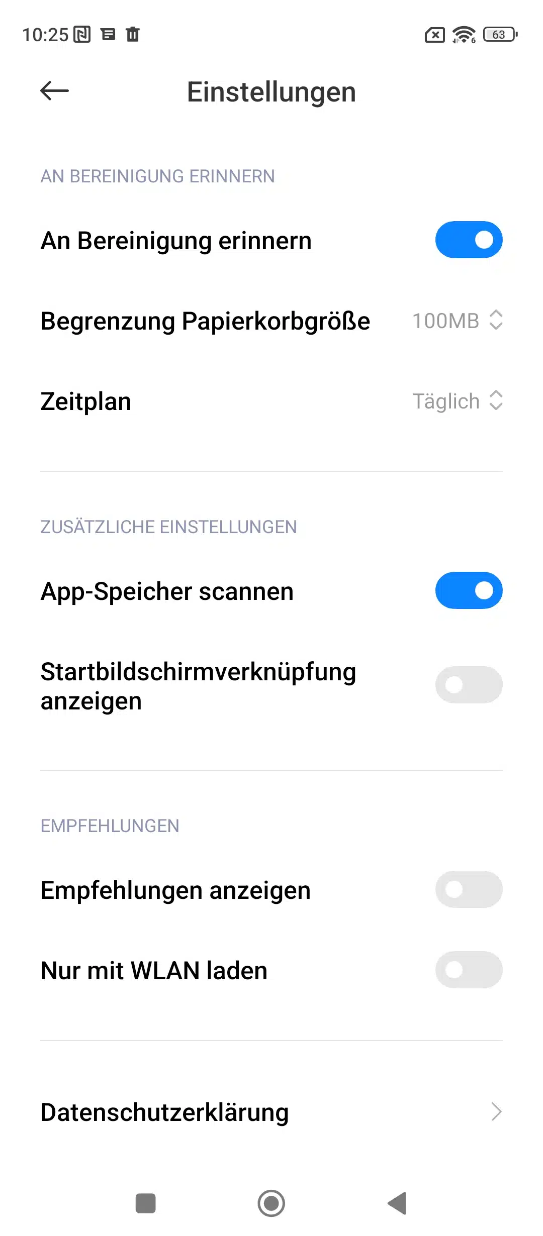 Wie üblich liegen einige vorinstallierte Apps auf dem Speicherplatz vor, diese können aber jedoch leicht deinstalliert werden. Ebenso liegt in Hauseigenen Apps integrierte Werbung vor. Diese lässt sich aber auch deaktivieren. Klickt auf die App „Bereinigung“ auf dem Starbildschirm, danach oben rechts auf das Zahnrad und relativ weit untern auf „Empfehlungen anzeigen“ und deaktiviert diese Position.
