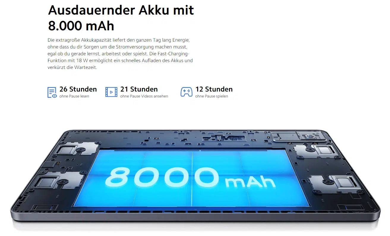Trotz des schicken und schlanken Designs hat man noch Platz im Aluminiumgehäuse (250,38 x 157,98 x 7,05 mm, 445g Gewicht) gefunden, um einen starken 8000 mAh Akku ins Innere zu verpflanzen. Beladen wird aber nur mit 18 W, auch wenn ein 22,5 Watt großes Netzteil dem Lieferumfang beiliegt.