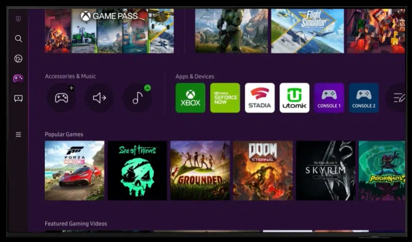 Interessant ist der Gaming-Bereich, da Samsung direkt Streaming Anbieter wie Xbox, Nvidia Geforce Now, Google Sadia und Utomik unterstützt. Anmelden/Account anlegen und auf dem TV ohne zusätzliche Hardware seien Spiele der jeweiligen unterstützten Plattform spielen. Klasse. Wie das ohne Controller? Ganz einfach: schnappt euch einen PS5 Controller, Xbox Controller oder anderer Bluetooth Lösungen und koppelt das Gamepad direkt mit dem TV.