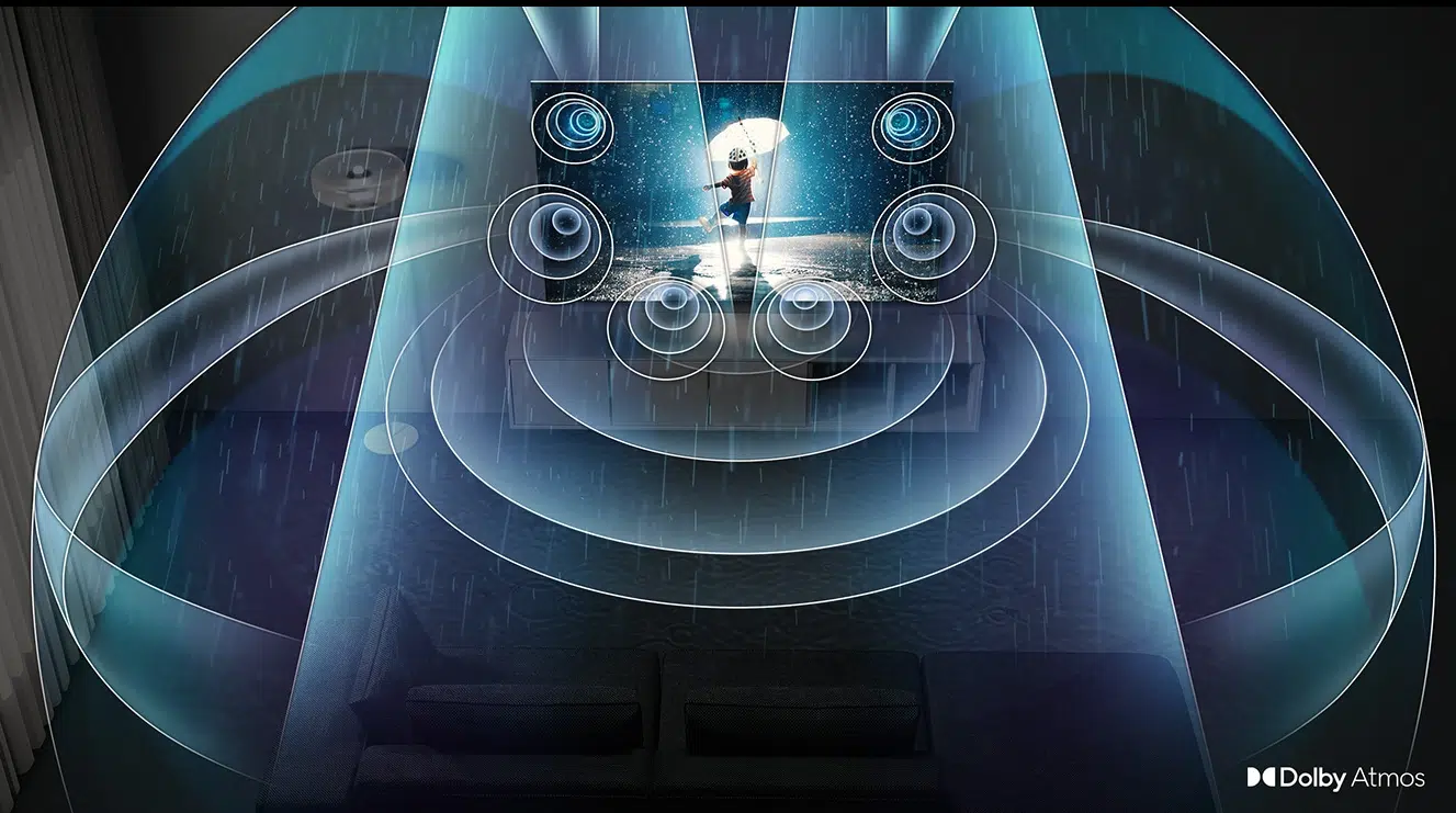 Bei den verbauten Lautsprechern setzt Samsung auf eine Dolby Atmos Wiedergabe und benennt ein 4.2.2 System, das auch nach oben abstrahlen kann. Klanglich soll so eine größere Dynamik im Raum erreicht werden. Vom Klang her spielen die verbauten Lautsprecher aber für meine Ohren eher im normalen Durchschnitt verbauter Lautsprecher mit. Hier macht eine separate Soundbar oder Anlage mit echter Atmos Unterstützung deutlich mehr her.