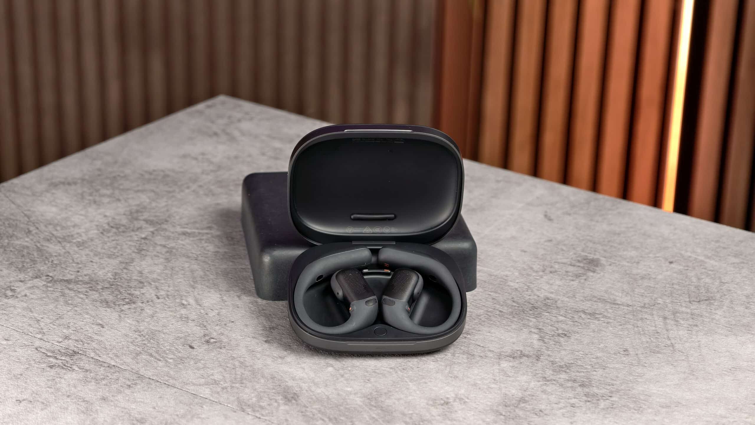 Optisch gibt es die Bügelform in Schwarz oder Weiß mit silbernen Akzenten. Das Ladecase fällt flach aus, lädt per USB-C oder kabellos und vervielfacht die Laufzeit deutlich.
