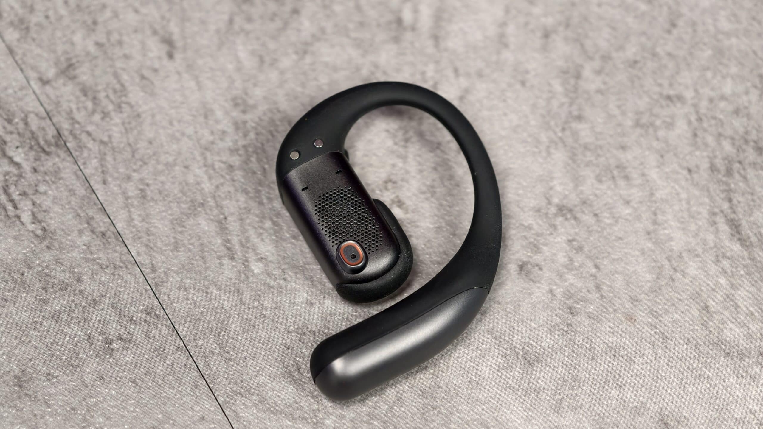 Die OpenFit Pro sitzen nicht im Gehörgang, sondern davor. Ein elastischer Bügel aus Nickel-Titan-Legierung mit Silikonbeschichtung legt sich über das Ohr, während die Treibereinheit vor dem Kanal „schwebt“. Das fühlt sich im Alltag erstaunlich natürlich an, weil kein Druck im Ohr entsteht. Mit 12,3 Gramm pro Hörer sind sie allerdings keine Leichtgewichte unter den Open-Ears.