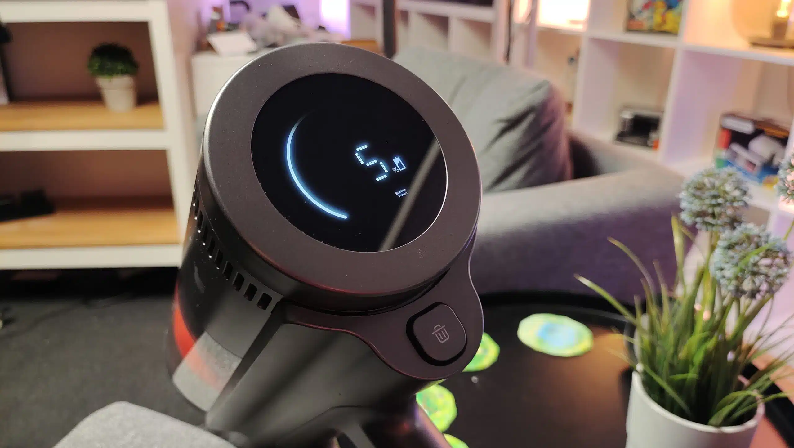 Bei dem Shunzao Z11 hat man sich für einen horizontal liegenden Staubbehälter entschieden, der am Ende bündig mit dem Rest abschließt. Bei den Farben hat man sich für Mattgrau mit orangen Highlights entschieden. Wie es bei Akkusaugern in dieser Preisklasse üblich geworden ist, besitzt auch der Shunzao ein Display, auf dem man alle wichtigen Informationen wie beispielsweise den Akkustand ablesen kann.