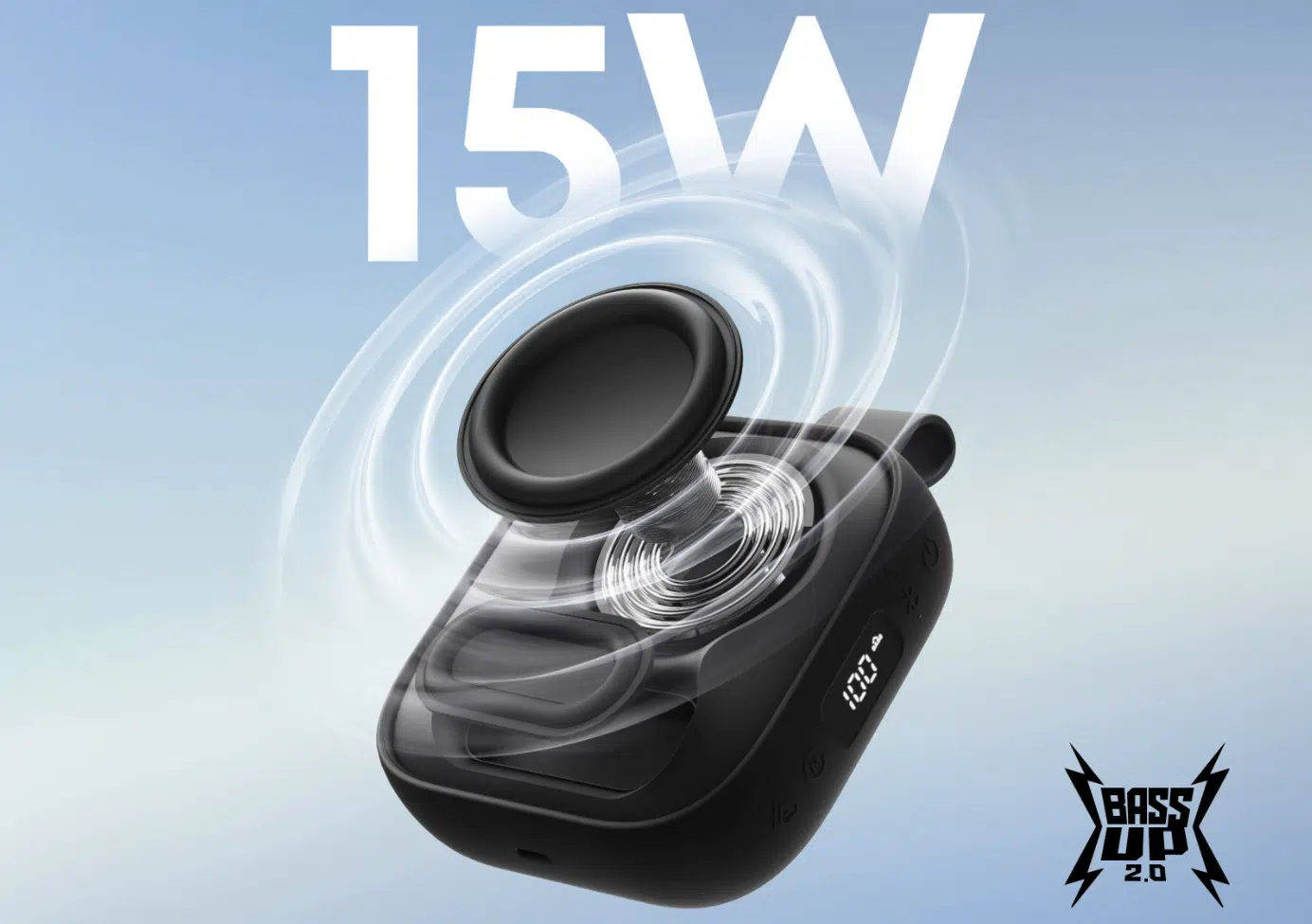 Im Inneren arbeitet ein Treiber mit 15 Watt Leistung. Unterstützt wird er von der bekannten BassUp 2.0 Technik. Diese Funktion verstärkt tiefe Frequenzen digital damit der Klang trotz der kleinen Bauform etwas kräftiger wirkt.