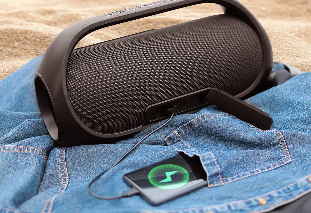 Es gibt zwei Passivstrahler beim Tronsmart Bang. Diese befinden sich links und rechts am Gehäuse. Auch der Tragegriff ähnelt sehr der Motion Boom, jedoch ist hier der Griff mehr abgerundet und bietet ein allgemein besseres Gesamtbild.