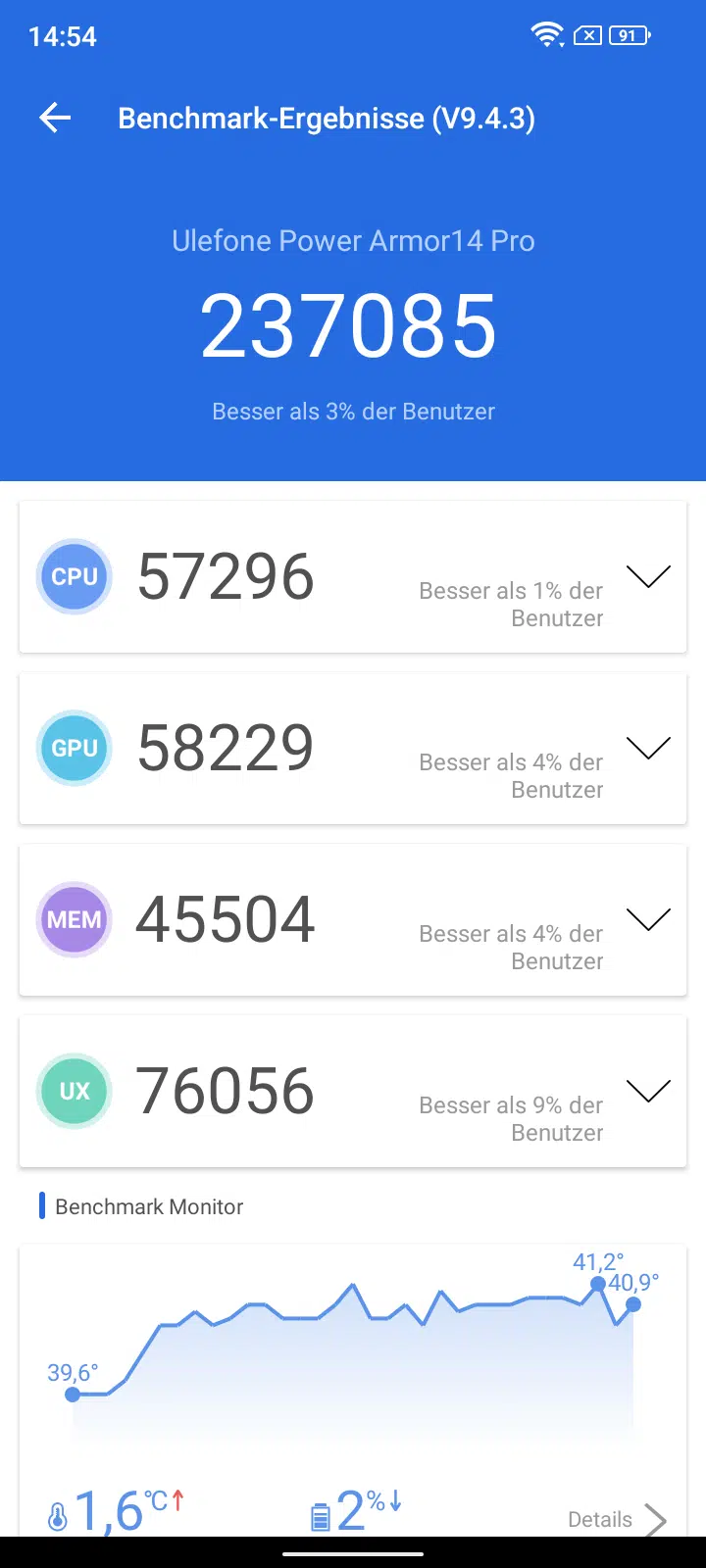 Tatsächlich verbaut Ulefone im Armor 14 Pro einen Helio G85 (Release Mai 2020), im Ulefone Armor 13 war es noch der deutlich flotterer G95 SOC. Der Octa-Core taktet mit maximal 2 GHz und ist noch in 12nm gefertigt. Leistungstechnisch werden unter Antutu etwas über 237.000 Punkte errechnet. Für den Alltag und normale Nutzung ist das für den Prozessor absolut kein Problem, seichte Spiele könnte man auch spielen. Das System läuft soweit auch meist flüssig, einige Animationen fühlen sich aber ruckelig an.