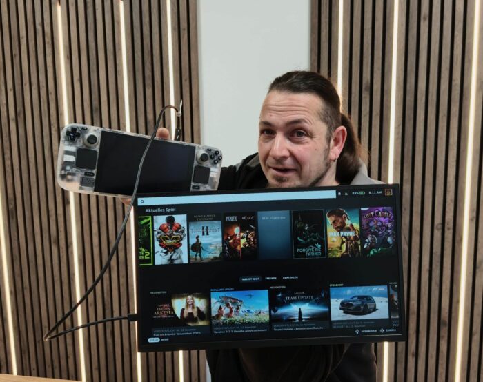 Das Steam Deck braucht eigentlich auch per Typ-C keine weitere Stromquelle. Wenn doch, liegt es tatsächlich am Kabel. Mit einem anderen nicht mitgelieferten hochwertigeren Kabel lief die Übertragung direkt ohne Probleme. Mit dem beiliegenden Kabel benötigte ich eine weitere Stromquelle. Wiederum an meinem Mini PC klappte es alles wie erwünscht: USB-Typ-C Kabel ran und Windows erkennt diesen Bildschirm ohne Probleme.