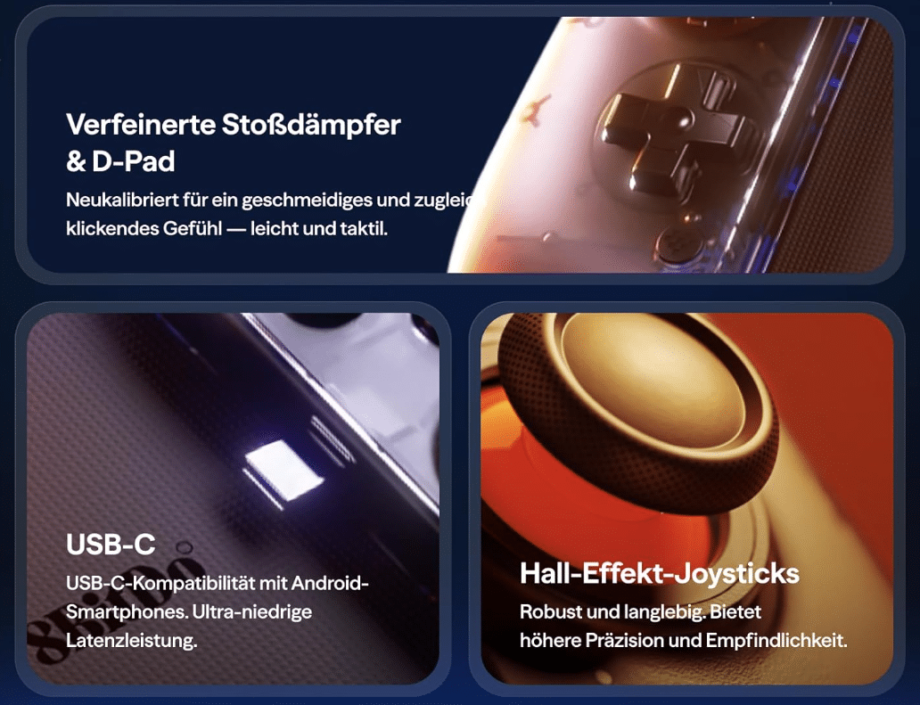 - Hall-Effekt-Joysticks und -Trigger: Diese Technologie nutzt Magnetfelder statt physischen Kontakts, um Bewegungen zu erfassen. Dies soll Drift-Probleme (Stick-Drift) minimieren und eine präzisere, langlebigere Steuerung ermöglichen.