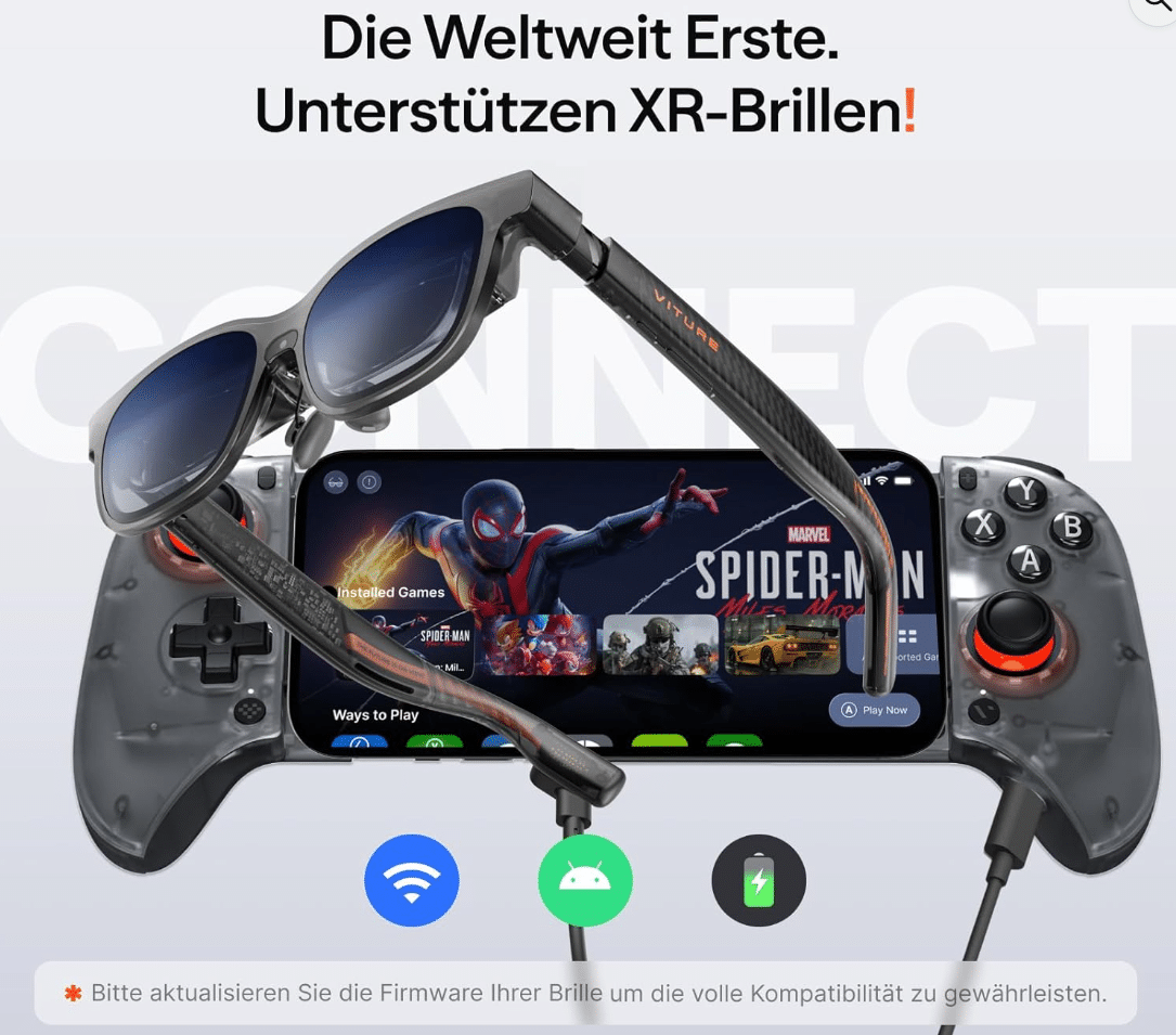 Obwohl der Controller primär für die exklusive Nutzung mit den VITURE XR Glasses (via USB-C Video-Ausgang) optimiert ist, kann er auch als reiner Controller für alle Android-Smartphones genutzt werden, die eine USB-C OTG (USB On-The-Go) Unterstützung haben. Das ist eine Standardfunktion und dürfte bei halbwegs aktuellen Smartphones kein Problem darstellen.