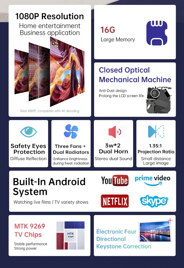 Auf die Leinwand bringen kann der Beamer Inhalte mit einer Größe von 40-120 Zoll. Das schafft der Projektor dank eines MTK9269 Prozessors und 1 GB RAM. Der interne Speicher hat eine Größe von 16 GB. Als Software setzt man auf Android 9 und wie schon beim Wanbo T6 Max, gibt es auch eine Google Assistent Unterstützung und Zugriff auf die meisten Streaming-Dienste.