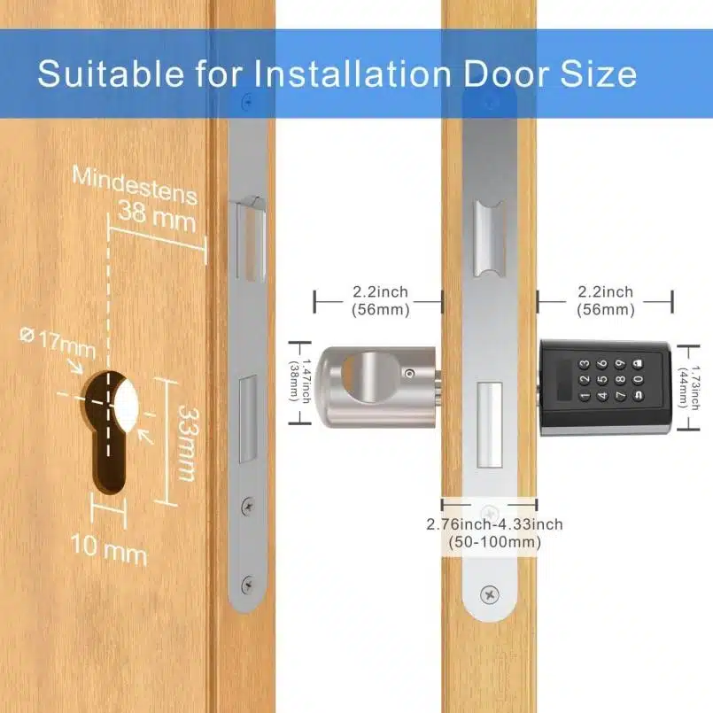 Die Abmessungen liegen bei 180 mm x 45 mm x 45 mm und einem Gewicht von 480g. Der Schließzylinder selbst ist verstellbar zwischen 55 mm und 105 mm und sollte so problemlos an jeder üblichen Tür funktionieren und einsetzbar sein. Der Hersteller wirbt mit einer Kompatibilität von Türen mit 5 bis 10cm Stärke.