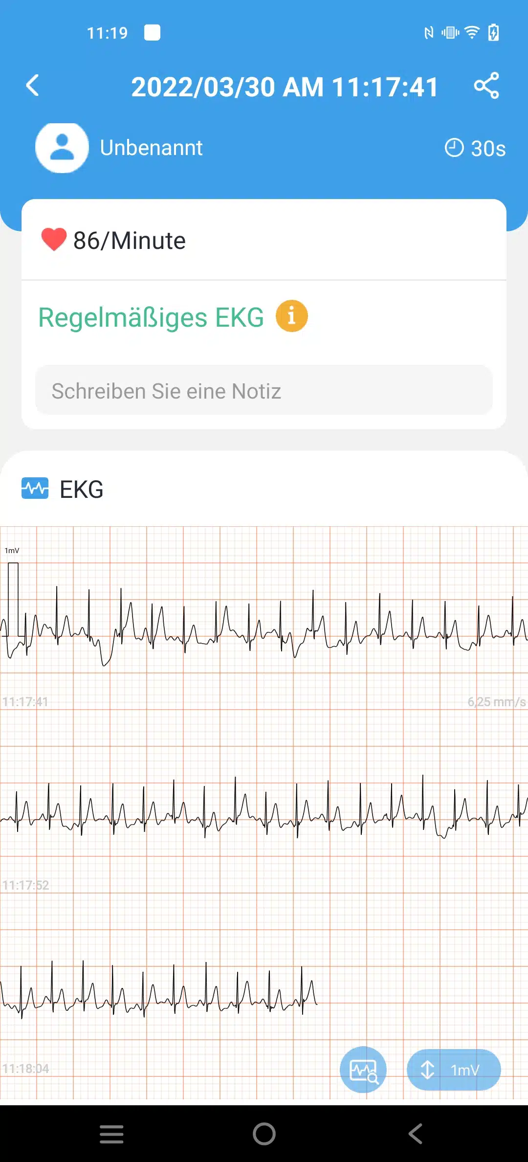 Richtig praktisch ist, dass man kein Kabel benötigt, um das Gerät nutzen zu können, da es direkt an der Manschette befestigt ist. So kann man auch ohne die App den Blutdruck oder EKG messen. Dazu gibt es ein kleines Display, was dann z.B. die Messkurve oder den Herzschlag anzeigt.