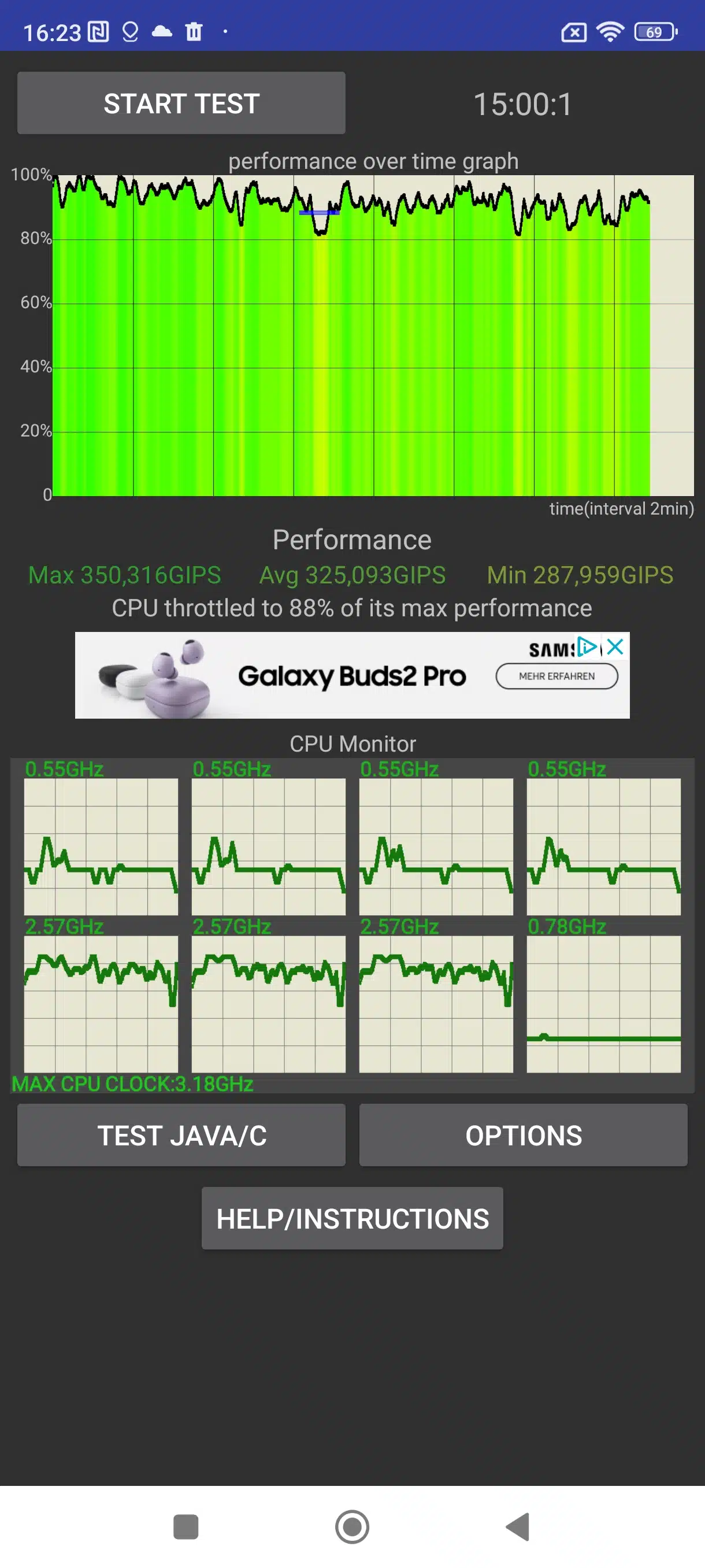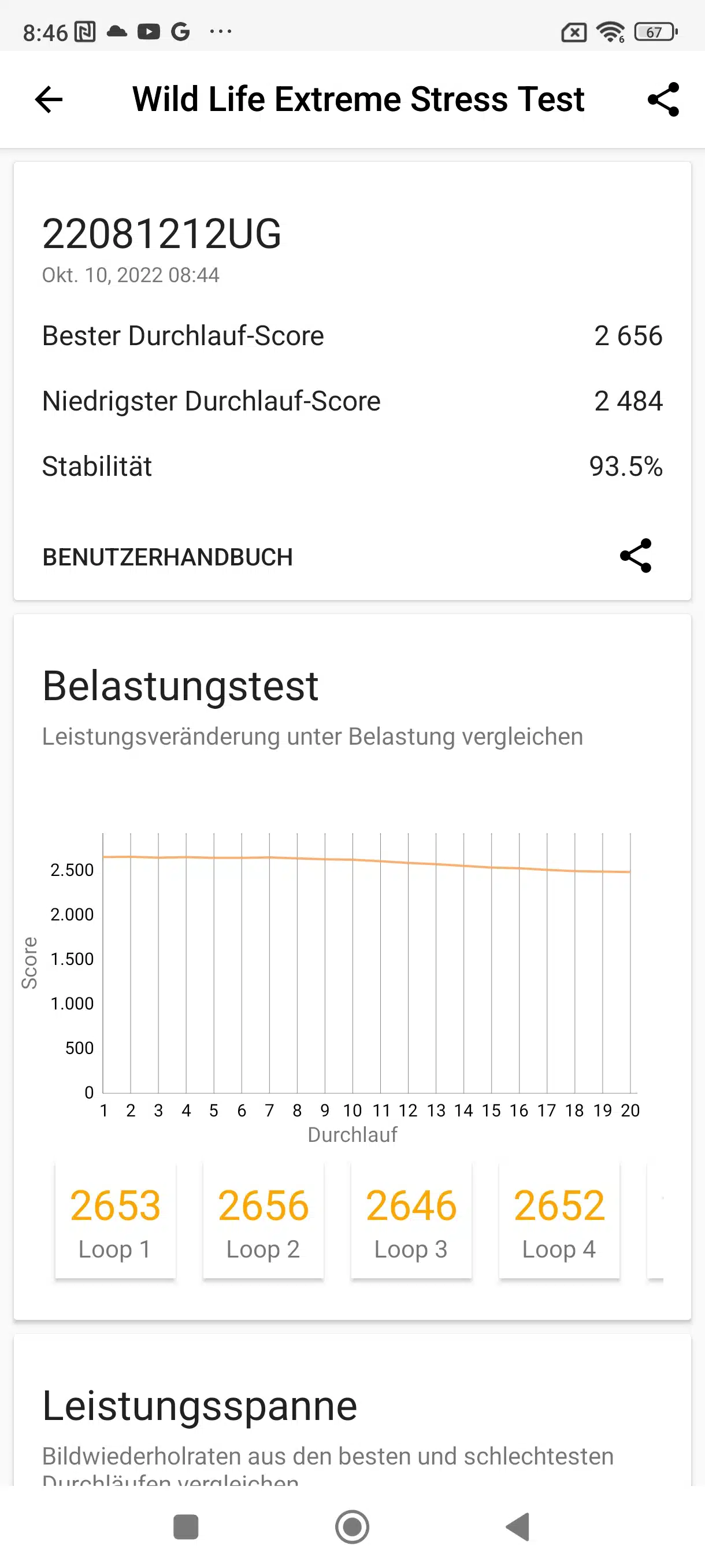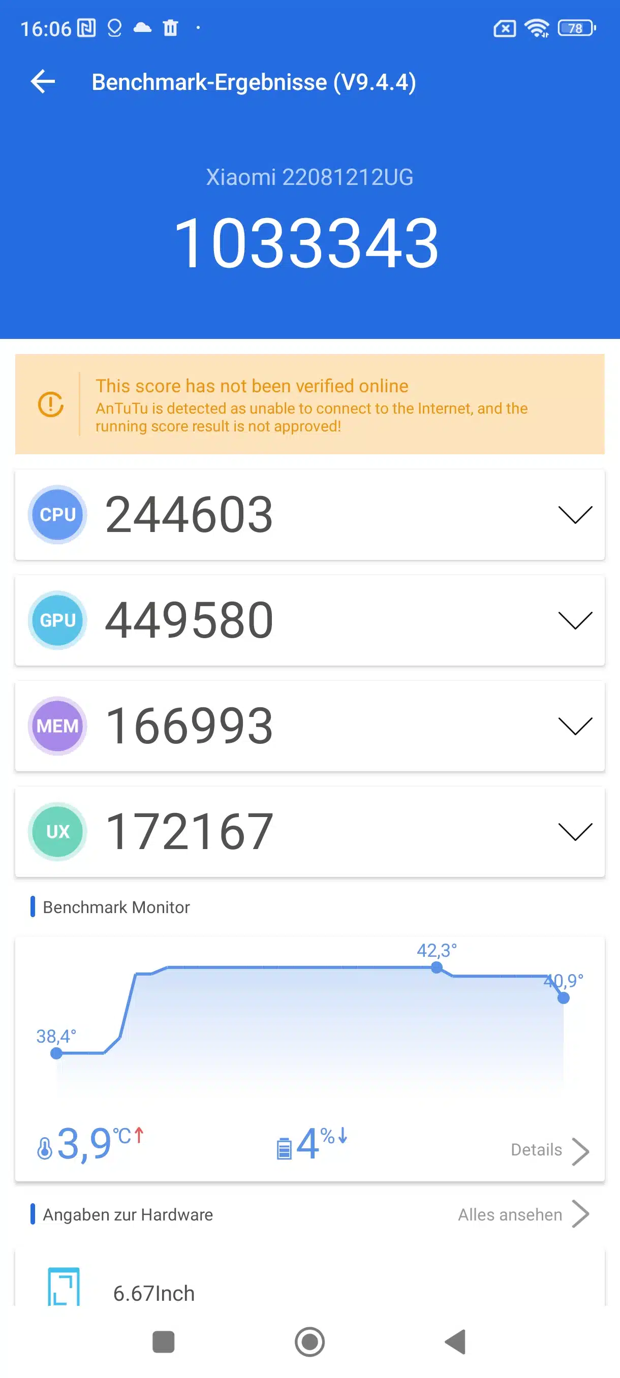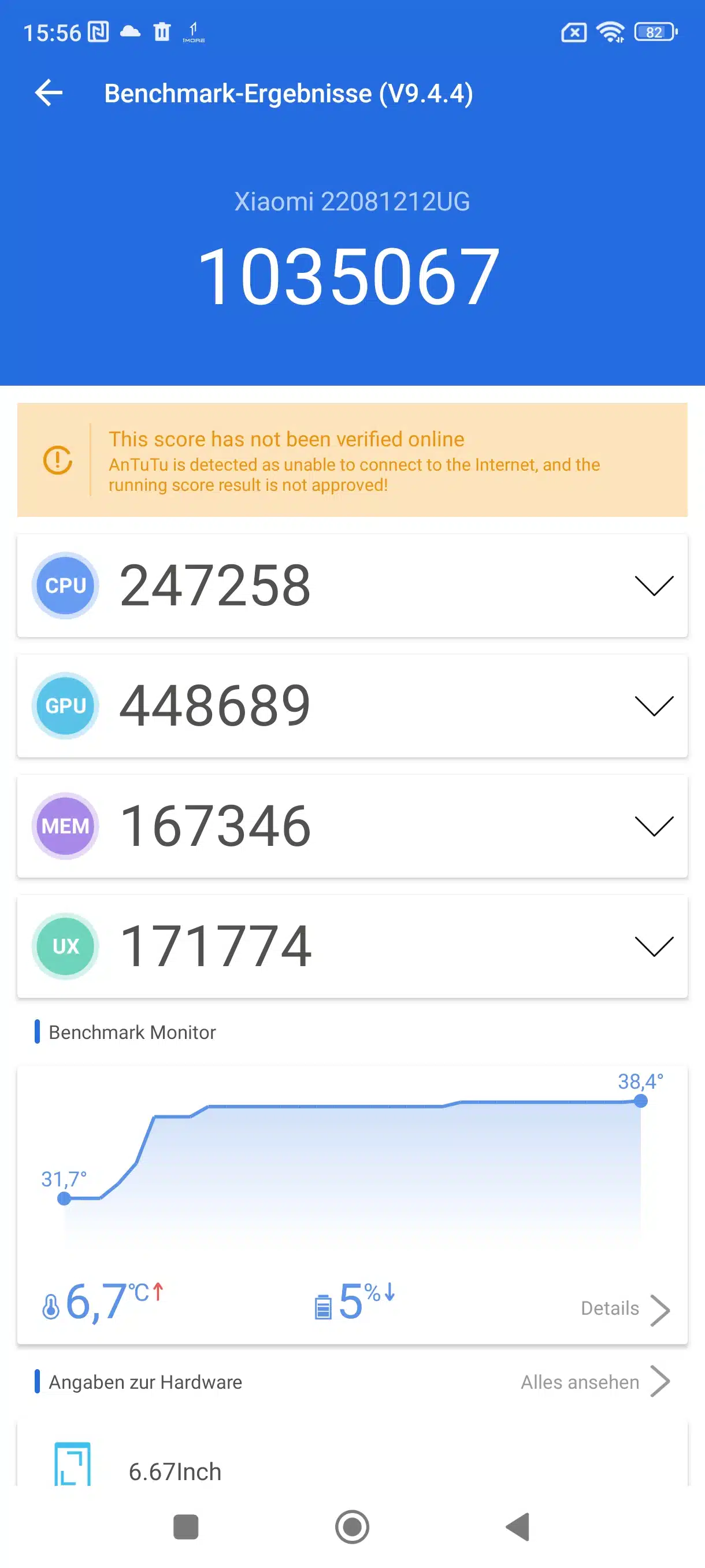 Auch blieb das System unter dem 20 minütigen 3D Mark Stress Test stabil. Hinweise das die App angehalten wurde, weil das System zu heiß wurde, hatte ich nicht. Das wohlgemerkt mit angelegter Silikon Schutzhülle.