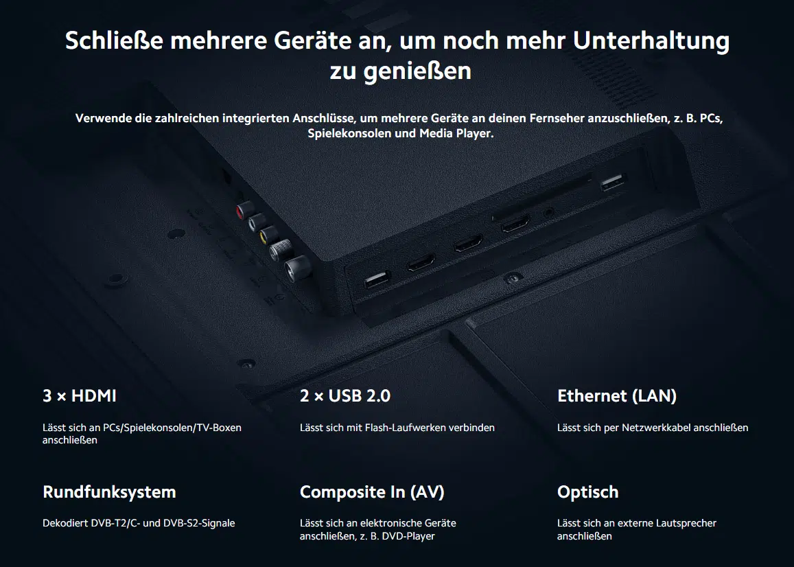| Anschlüsse | 1x HDMI 2.1 (eARC), 2x HDMI 2.0, 2x USB 2.0, AV Input, Ethernet LAN, optischer Audioausgang, CI+ Slot (1.3), Composite In |