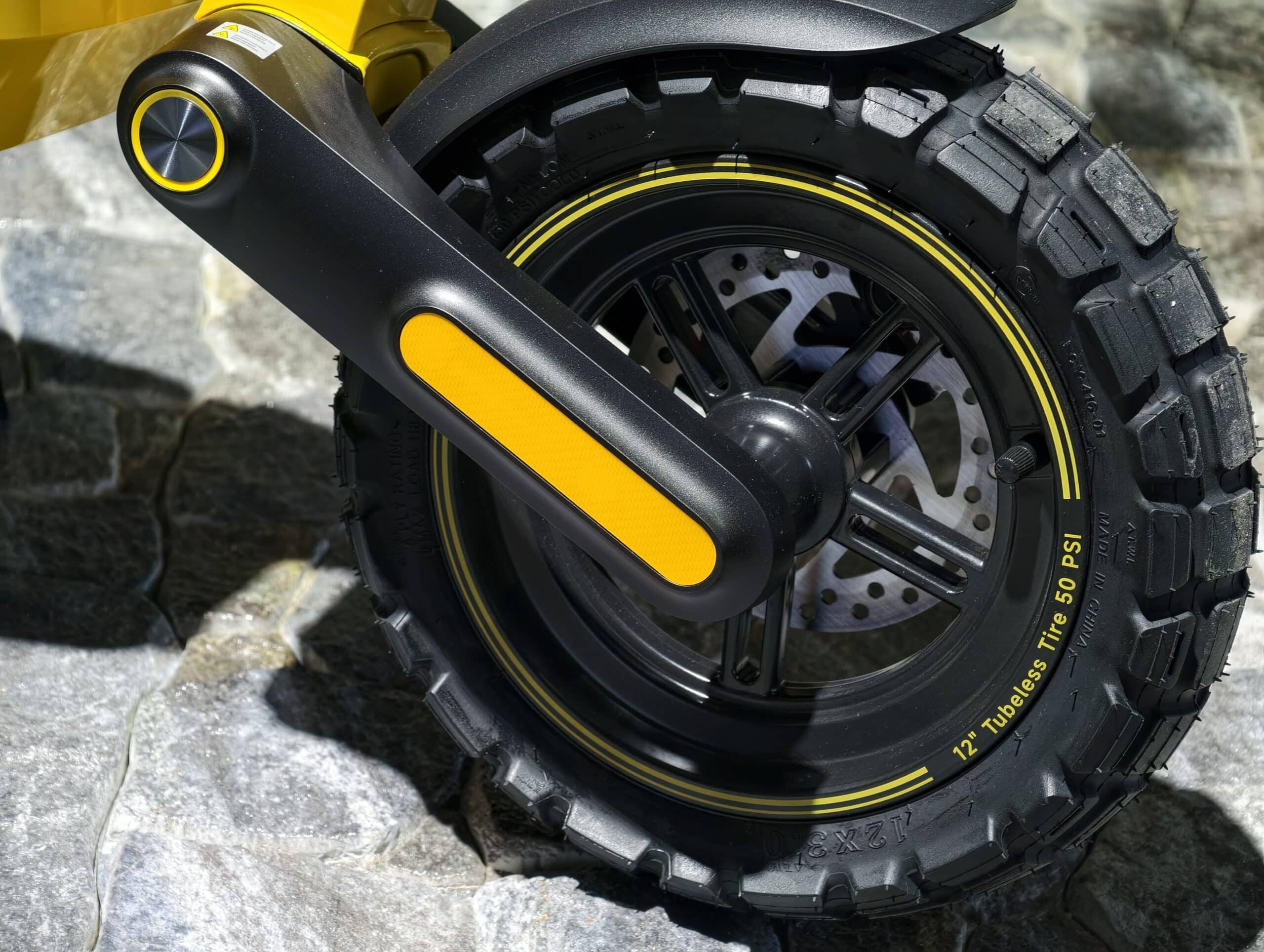 Um das hohe Gewicht und die Leistung sicher auf die Straße zu bringen, verbaut Xiaomi nun 12-Zoll-All-Terrain-Reifen. Diese sind deutlich größer als der Marktdurchschnitt von 8,5 bis 10 Zoll, was die Überwindung von Hindernissen wie Bordsteinkanten erleichtert und zudem auch mehr Lauffläche und Kontakt zum Untergrund darstellt.